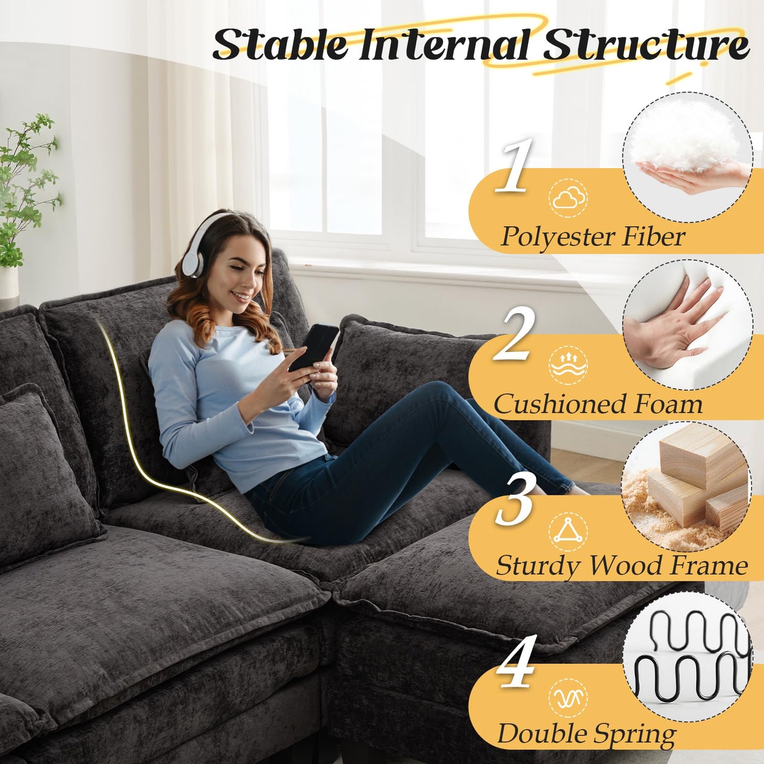 SAMERY Modular Sectional Sofa, 113" L Shaped Couch Set for Living Room Comfy Cloud Couch with Movable Ottoman, Extra Deep Seat Sofa Sleeper with 5 Pillows, Black Chenille 3-Seater Sofa