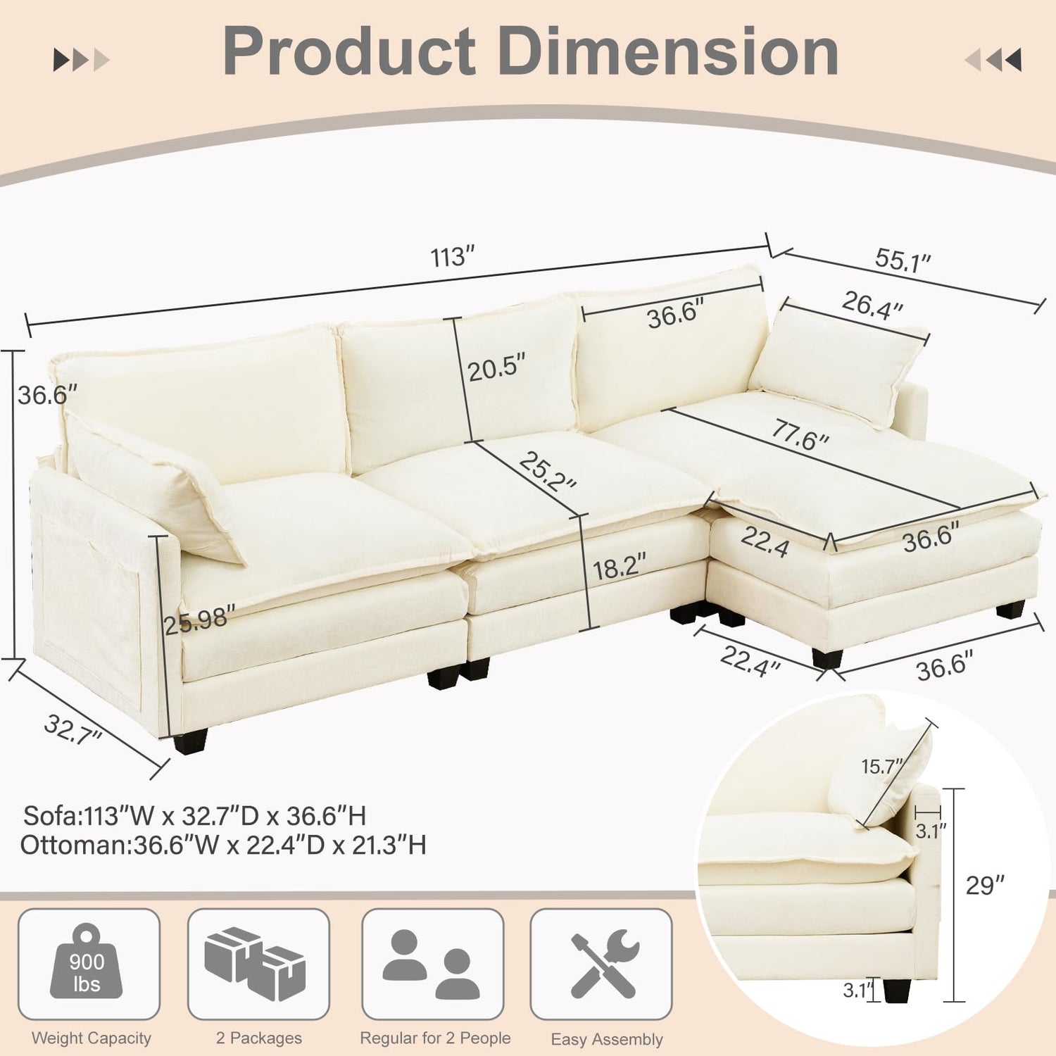 SAMERY Sectional Sofa Cloud Couch, 113" Big Comfy Couch L Shape Sofa Couch for Living Room Extra Deep Seat Sofa Couch Chenille Sofa Sleeper with Ottoman/Pillows, Cream White 3 Seat Sofa Cloud Couch
