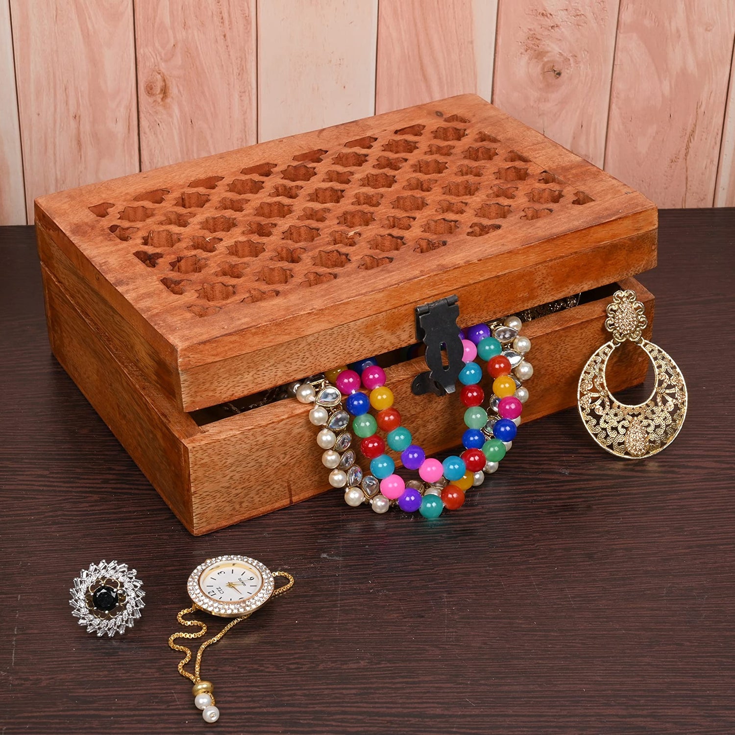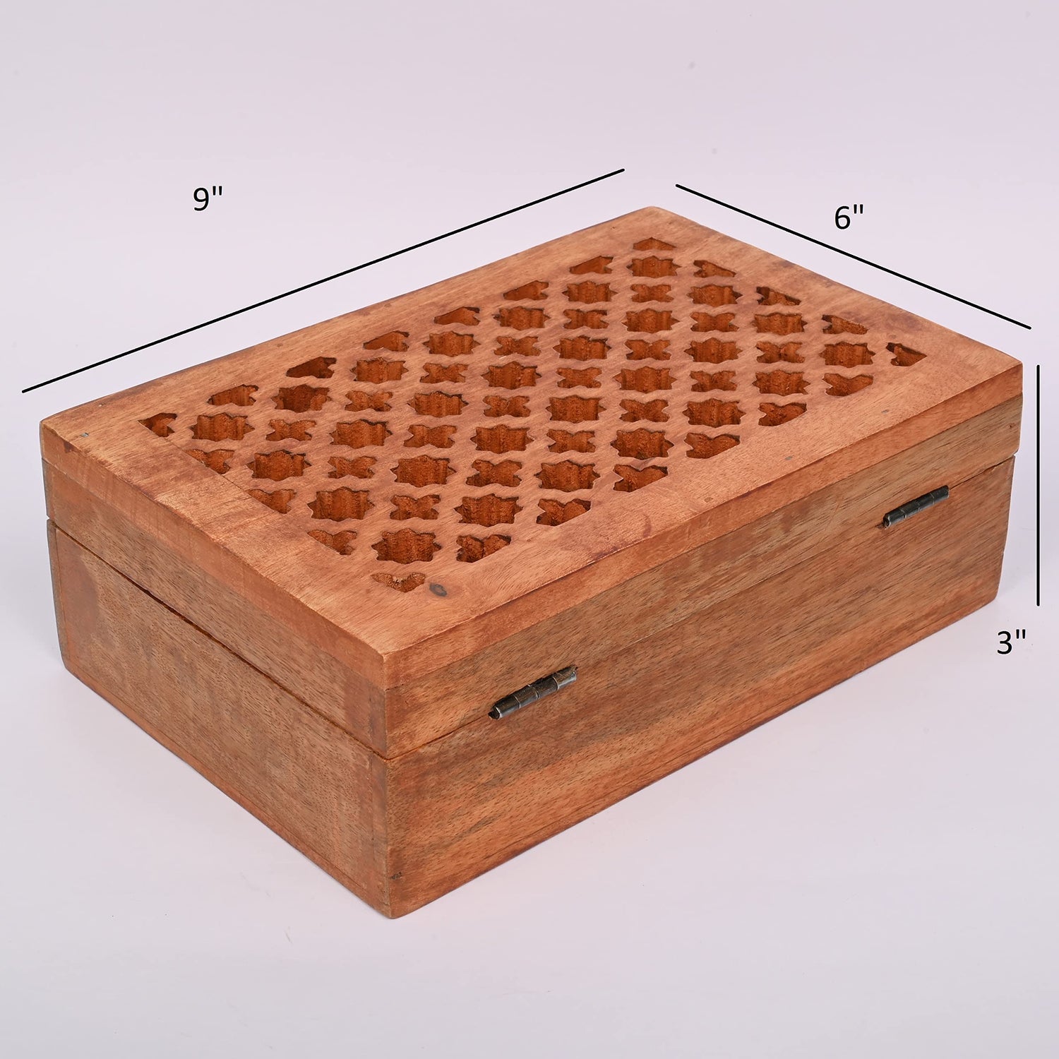 Samhita Mango Wood Decorative Wooden Box with Hinged Lid in Jali Carvings Used as Storage Box Christmas Gifts Items (9" x 6" x 3')