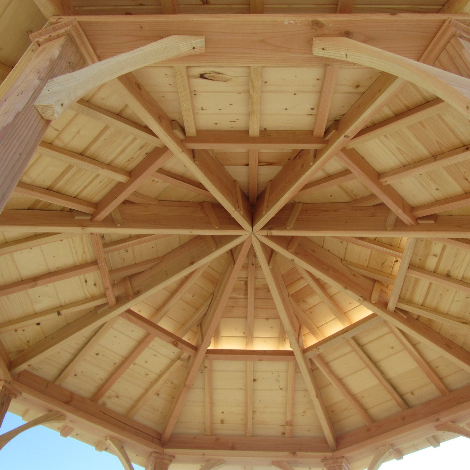 Indulge in a cozy outdoor space with this craftsman's stylized hand sculpted gazebo. This unique gazebo kit is a SamsGazebos exclusive including 7 longer and 1 standard posts to accommodate an uneven patio which guarantees a professional and perfect installation. Constructed of North American Douglas Fir, Spruce, and Cedar, all parts are preassembled and pre-drilled for easy installation with only two people. All bolts, nails, screws, hardware, and illustrated step-by-step instructions are also included. Ready to finish to your liking. At least a 10' x 10' foundation or a 10' 7" x 10' 7" area for the overhang is required. Minimum width between the posts is 34". With FREE continental US shipping, this kit will be delivered to your curbside by a motor freight and customers are responsible to transfer it to inside a property. E-mail us if you have a level floor such as a wood deck; we can make all posts same and ship the necessary hardware at no extra charge. 10 year limited warranty from America�s top gazebo manufacturer for over 30 years.