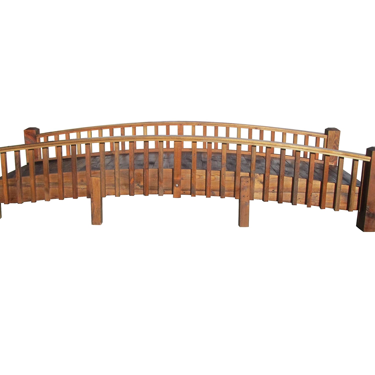 Details: Gracefully arched 12 feet commercial grade wood garden pond bridges for your landscaping project. Durable construction with 6 x 6 posts, 2 x 10 floor boards over 4 full length floor joists. The rails are 13" high (33 cm) from the walking surface. Overall 142" long( 360 cm), 53-1/2" inch wide(136 cm). Ready to finish to your liking. Total weight is 1,200 lb. (544 kg) and weight capacity 1,000 lb.(453 kg). Made to order, please allow a week to ship. Shipped by motor freight as a kit to assemble. Easy assembly: 2 rails, 2 end frames, 2 small and 2 large floor joists, 12 floor boards, and 2 end floor boards.