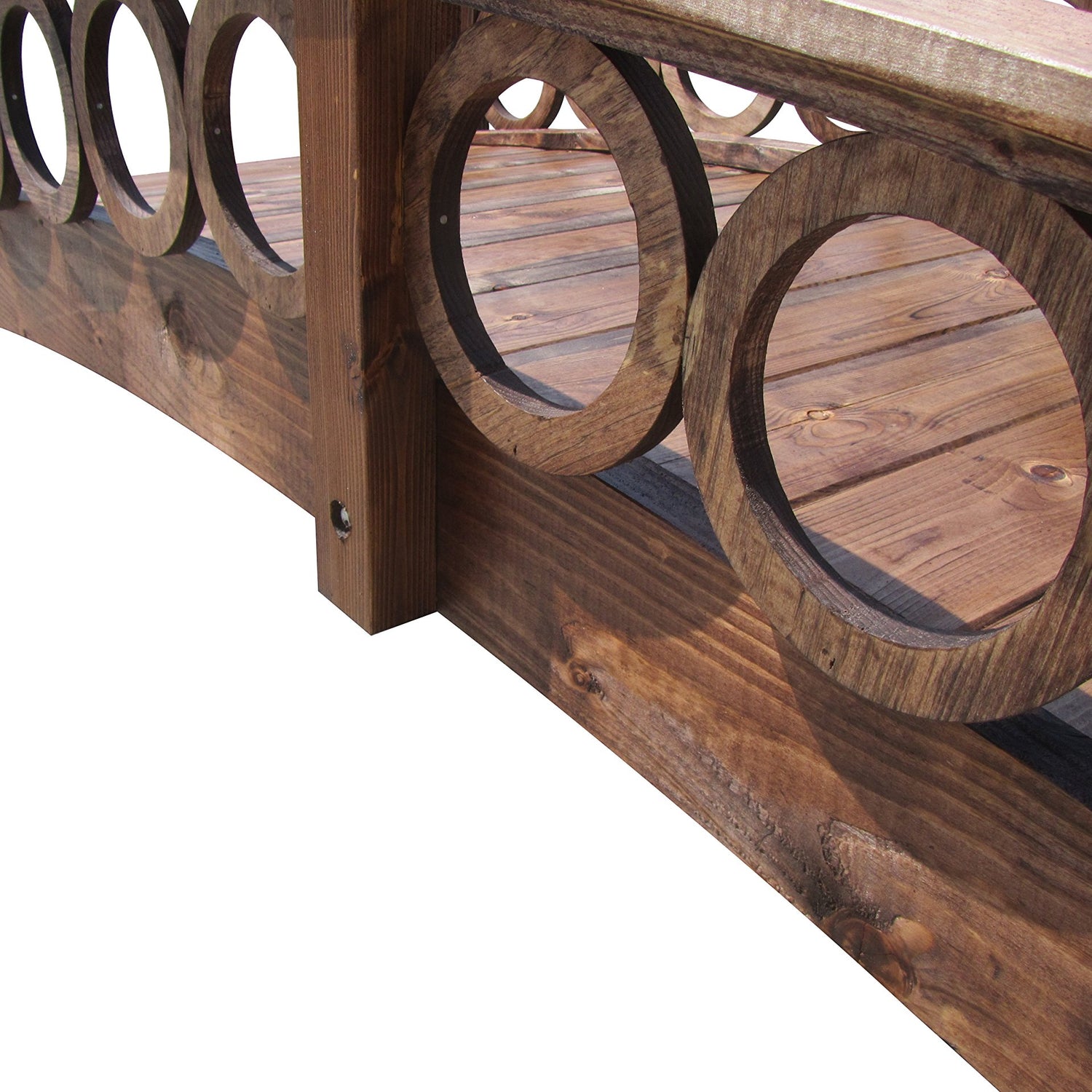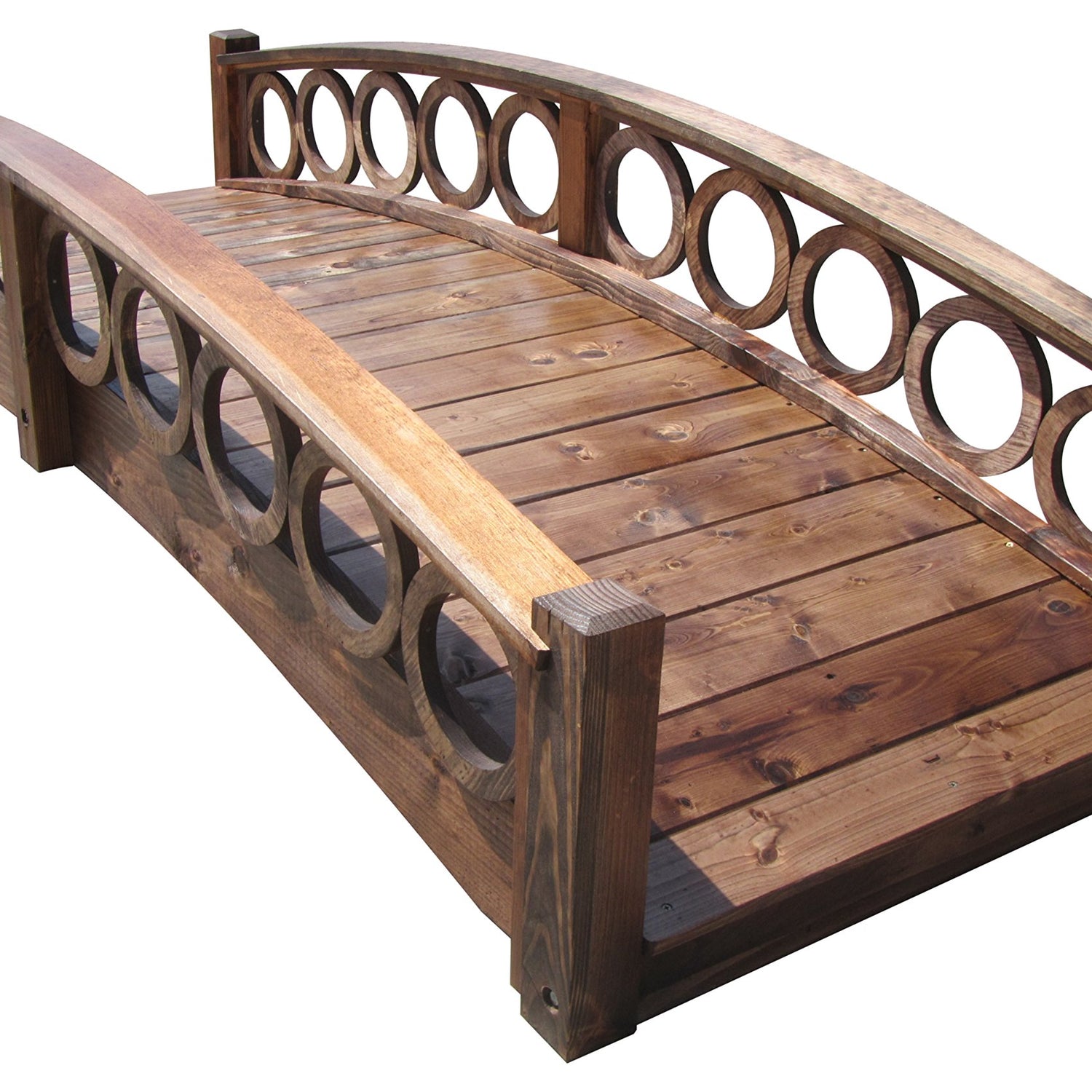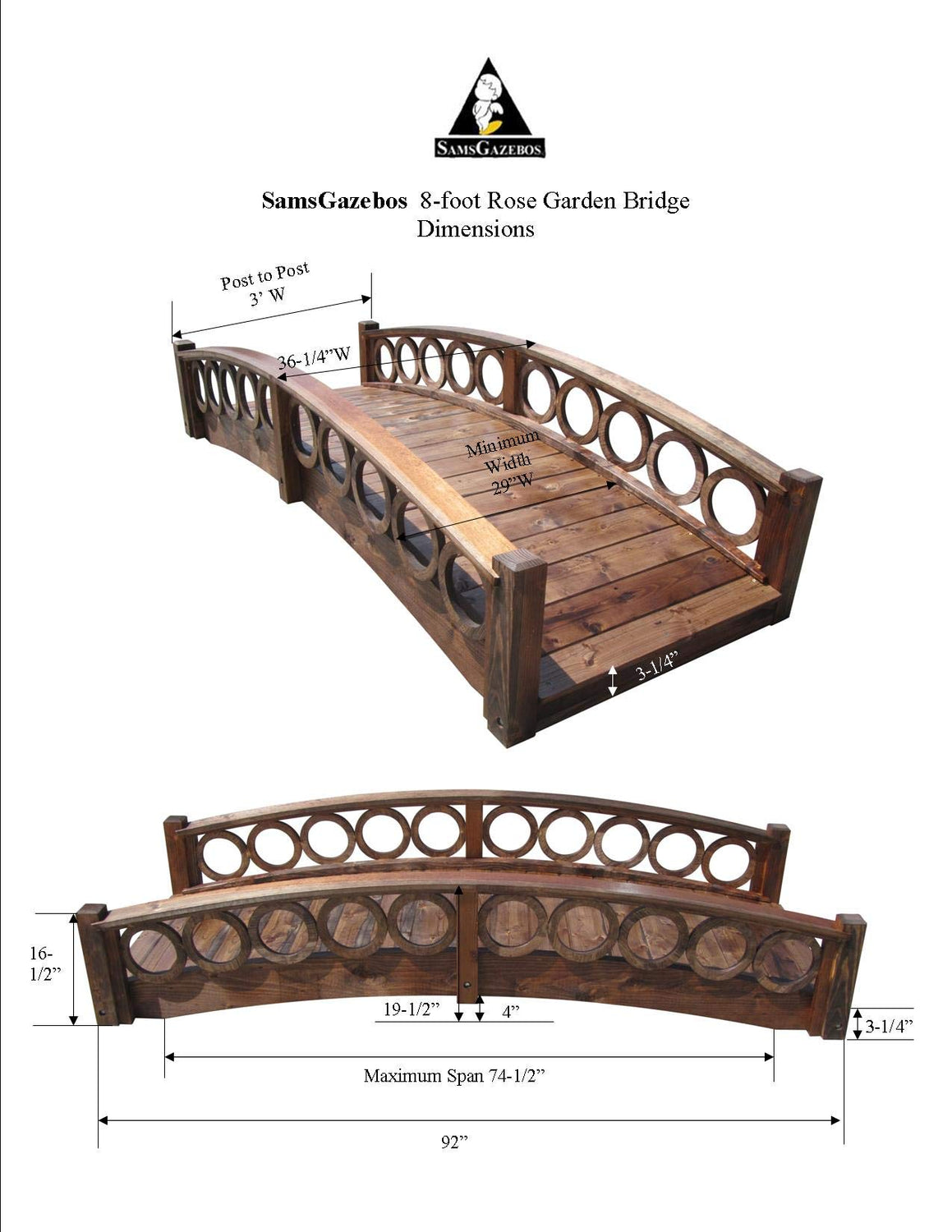 This elegant French garden bridge featuring unique ring railings enhances your garden, pond, or walkway. Made in the USA, custom built quality, labor of love, and great value. Primary material is North American Douglas Fir and clear Pine. A gracefully arched wooden garden bridge to highlight your rock garden, pond, or creek. Supported by two full length floor joists, mildly arched tongue and groove flooring is durable and easy to walk on. Treated with oil-based semi-transparent brown wood preservative, ready to finish to your liking such as a solid deck stain. Pilot holes assure a perfect fit and easy assembly with construction grade hardware. For residential use only. The minimum walking width is 29 inches (74 cm). Maximum capacity: 450 lb. (204 kg) It spans up to 74-1/2" (189 cm between the arches at the bottom).  Dimensions: 95" L x 21" H x 37" W (241 cm L x 53 cm H x 94 cm W) End Posts are 2-3/4" x 2-3/4 " (7 cm x 7 cm)Â. Item Weight: 105 lb. (47.6 kg) Shipping Weight: 115 lb. (52 kg) Shipping Dimensions: 92" L x 22" H x 13" W Made to order. Please allow 5 days to ship. Please contact info@samsgazebos.com for a quote if you are interested in large bridges for commercial projects.