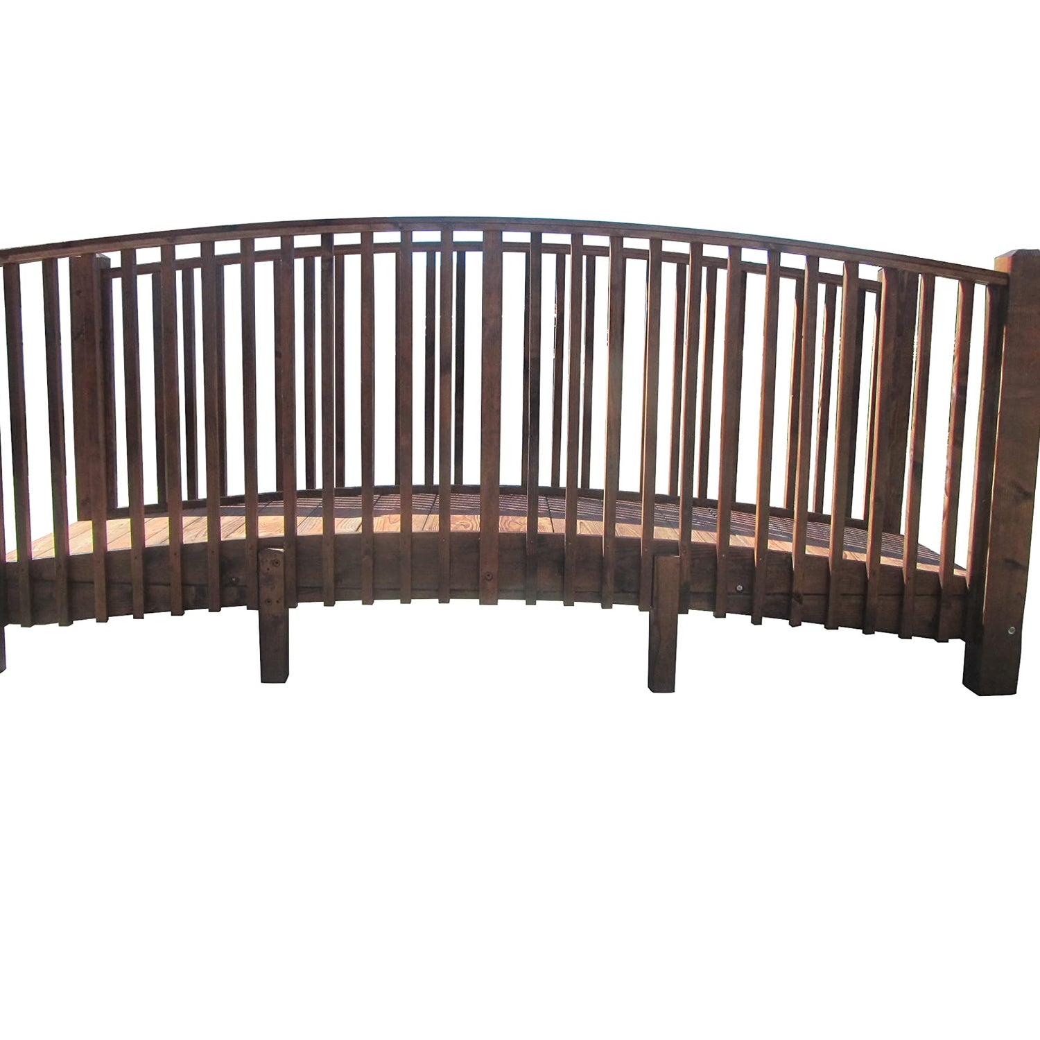Details: Gracefully arched 12 ft commercial grade wood garden pond bridges for your landscaping project. Durable construction with 6 x 6 posts, 2 x 10 floor boards over 4 full length floor joists. The rails are 42" high (107 cm) from the walking surface. Overall 142" long( 360 cm), 53-1/2" wide(136 cm). Ready to finish to your liking. Total weight is 1,400 lb. (635 kg) and weight capacity 1,000 lb.(453 kg). Made to order, please allow a week to ship. Shipped by motor freight as a kit to assemble. Easy assembly: 2 rails, 2 end frames, 2 small and 2 large floor joists, 12 floor boards, and 2 end floor boards.