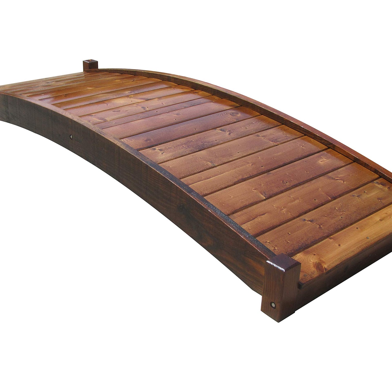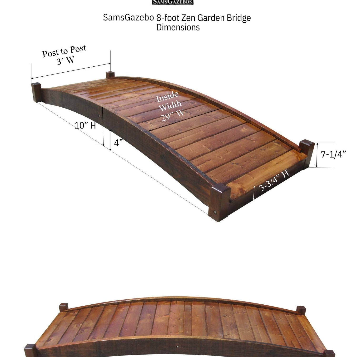Details: Our gracefully arched garden bridges blend into any landscape theme, highlight your water features and rock gardens, adding a spirit-nurturing Zen aspect to your garden. It spans up to 77 inches. Handcrafted of North American Douglas Fir and Pine, with durable construction of custom quality and labor of love.  Residential use only. Understated yet stylish Japanese garden bridges to enhance your rock garden or pond. Our exclusive interlocking construction for aesthetic sleek designs with fewer screws and long-lasting products. Supported by two full length floor joists, mildly arched flooring is durable and easy to walk on. Treated with oil-based semi-transparent brown wood preservative, ready to finish to your liking such as a solid deck stain. It spans up to 77" (196 cm between the arches at the bottom).  Pilot holes assure a perfect fit and easy assembly with construction grade hardware. 250 lb. (113 kg) maximum load capacity.  For residential use only.  Dimensions: 92" L x 10-1/2" H x 36" W (234 cm L x 27 cm H x 91 cm W) End Posts are 2-3/4" x 2-3/4 " (7 cm x 7 cm)Â. Item Weight: 95 lb. (43 kg) Shipping Weight: 100 lb. (45 kg) Shipping Dimensions: 94" L x 13" T x 13" W Weight Capacity: 400 lb. (181 kg) Please contact info@samsgazebos.com for a quote if you are interested in large bridges for commercial projects.