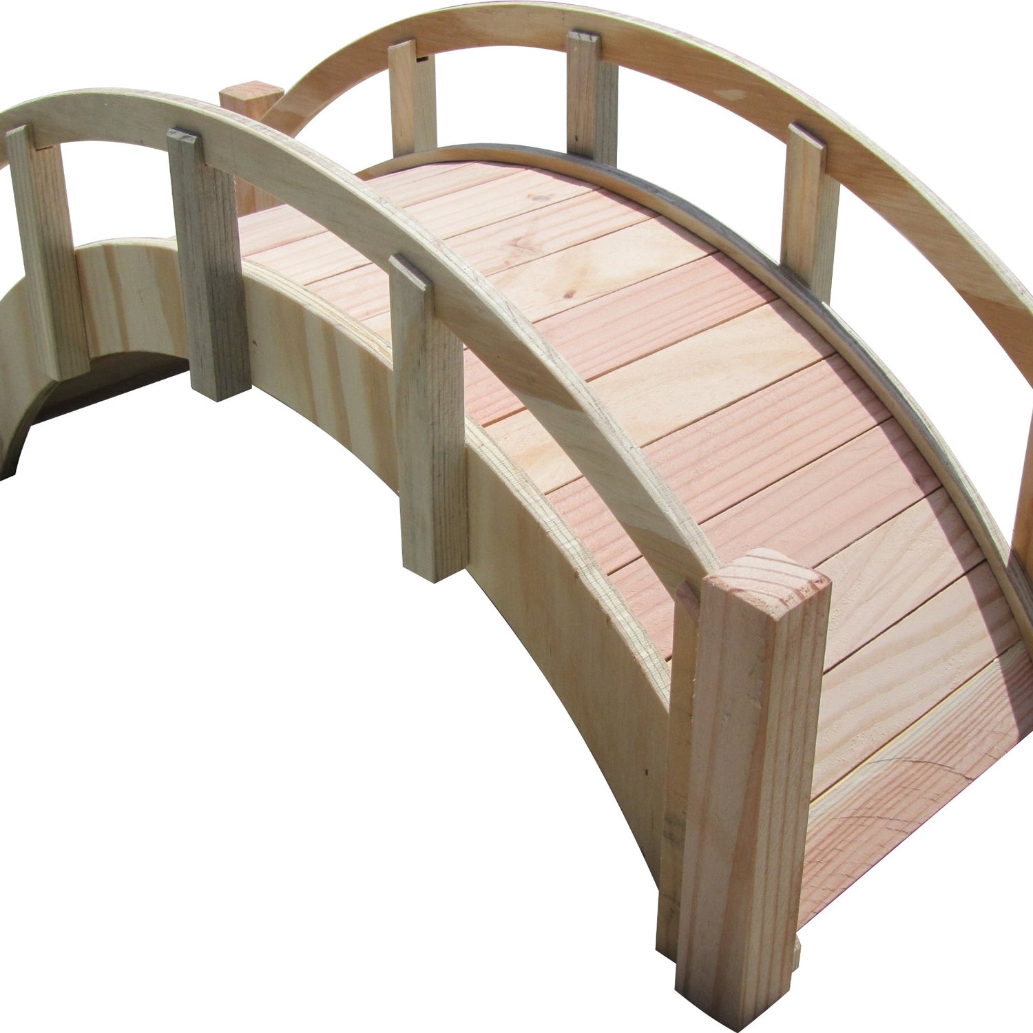 Details: Create a babbling brook or pond underneath to highlight this gracefully arched wood bridge. Use stones and floras to establish a peaceful garden. For decorative use only. Handcrafted with a superb craftsmanship of a 4th generation boat builder. Also available in a different finish.