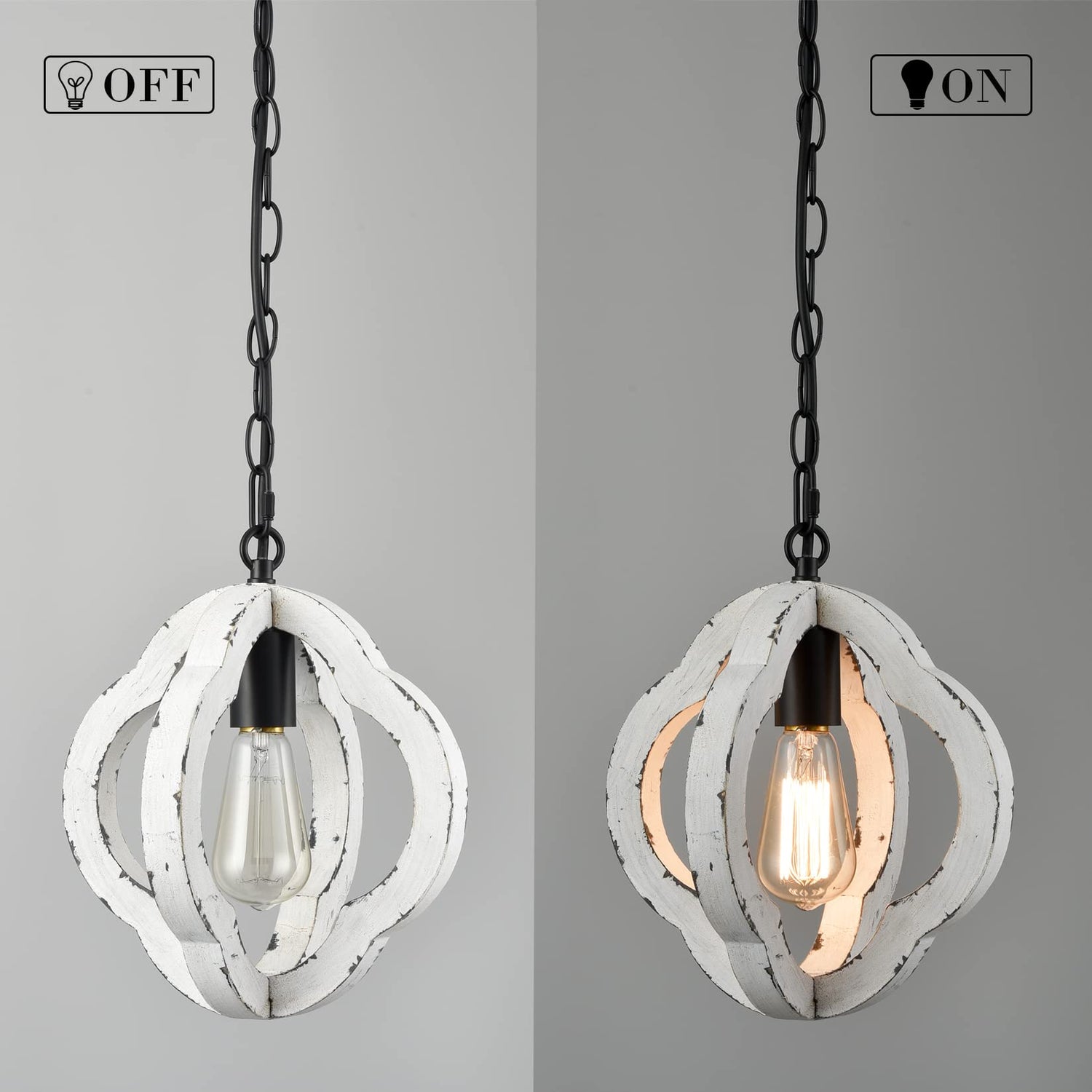 - 🌲Modern Farmhouse Wood Pendant Light- The pendant light combines black metal lamp body and distressed white wood frame, bringing a modern farmhouse charm decoration to you living spaces.