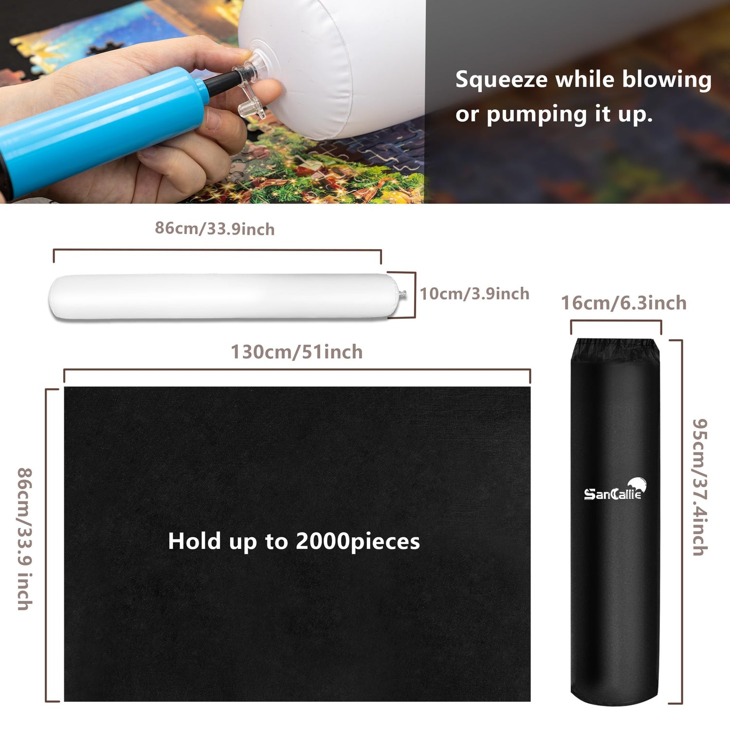 Sancallie Jigsaw Puzzle Mat Roll Up, 51"x34" Jigsaw Storage Felt Mat, Jigroll up to 2,000 Pieces, Gift Box with Drawstring Storage Bag, 3 Elastic Band, Hand Pump, Portable Puzzle mat