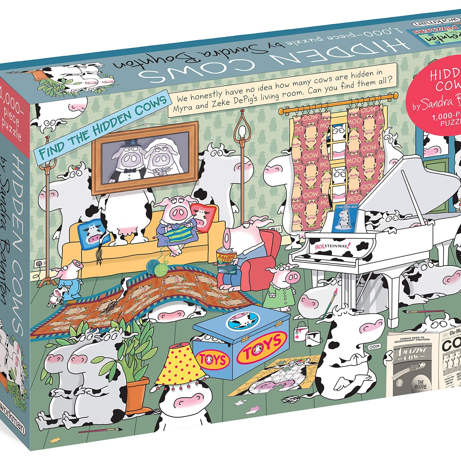 Details: The wit of Sandra Boynton, in jigsaw puzzle form: We honestly have no idea how many cows are hiding in Myra and Zeke DePig's living room. Can you find them all?