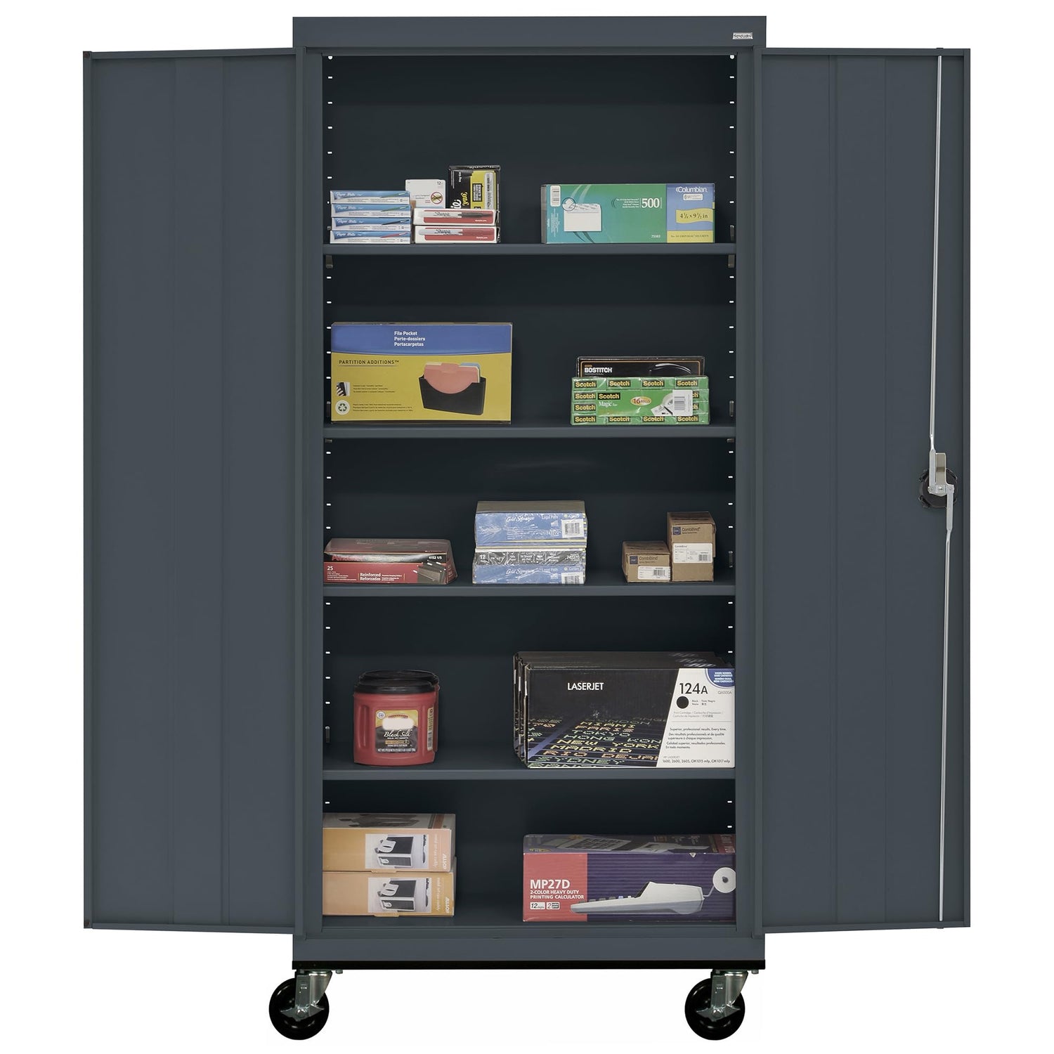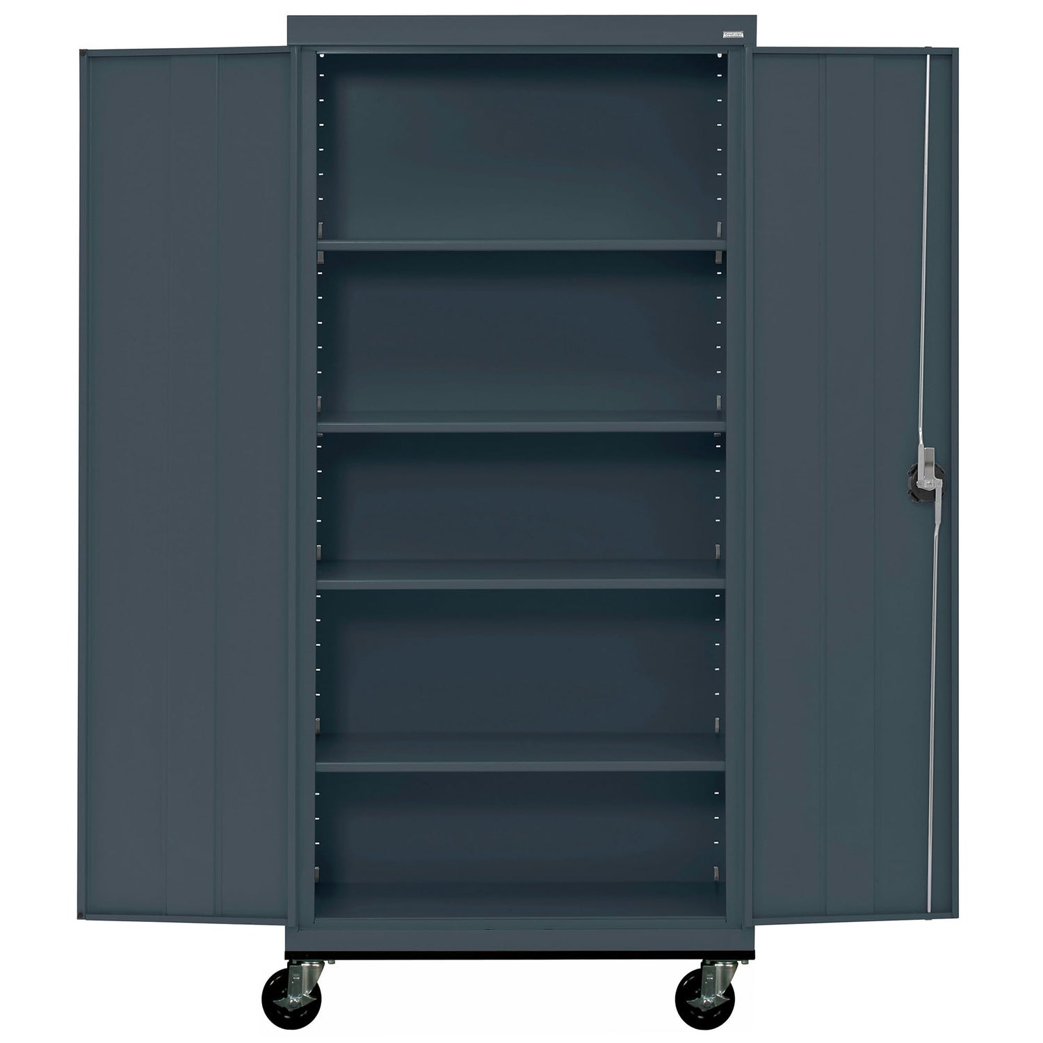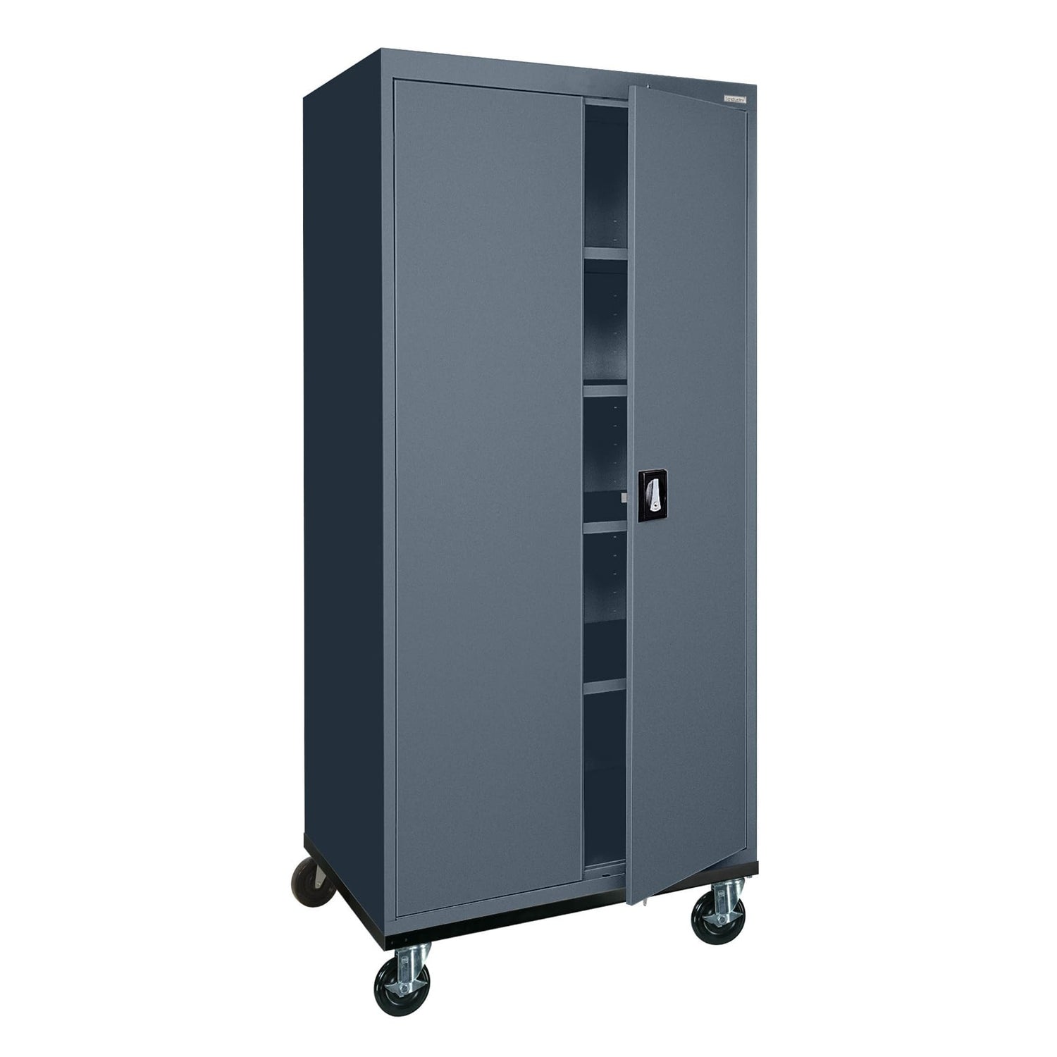 Details: The Sandusky Lee Transport Series Mobile Storage Cabinet is constructed from heavy-gauge welded steel (20/22 gauge) for robust durability. The metal storage cabinet with wheels features a recessed locking handle with a 3-point locking system, ensuring secure mobile storage for use in offices, garages, classrooms, workshops, and more. This large-capacity cabinet includes four adjustable shelves, each supporting up to 230 lbs, and a 230 lb capacity raised floor shelf. Equipped with a heavy-duty 12 gauge caster base with four 6-inch swivel casters and smooth-rolling 5-inch wheels (two with side brakes), all mounted on a steel plate base and bolted through the cabinet bottom. A false bottom conceals the bolts, creating a raised floor shelf. The swivel wheels tuck under the base, allowing the cabinet to fit flush against walls when not in use. Its Greenguard Gold certified powder coat finish ensures low chemical emissions for improved air quality while providing a durable and attractive surface. The heavy duty storage cabinet ships fully assembled. Please note, caster attachment is required.