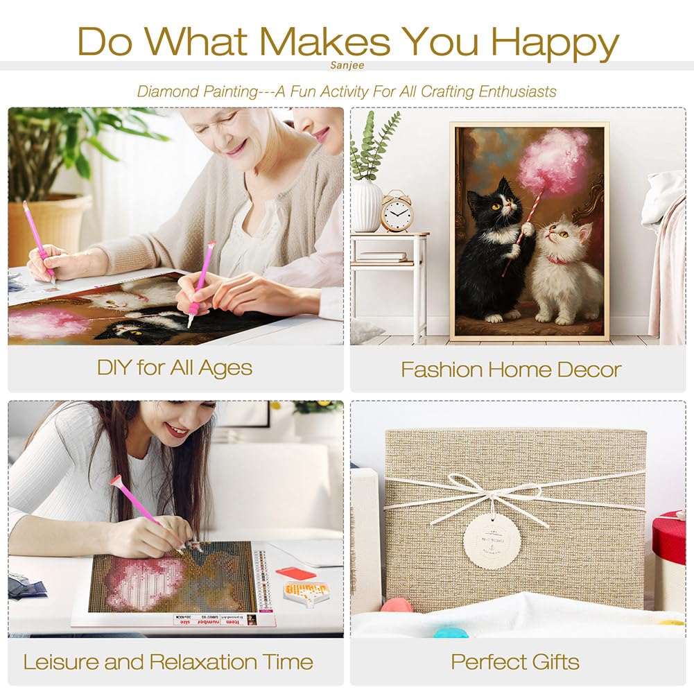 Sanjee Diamond Painting Kits for Adults, Cute Cats Diamond Art Kits for Beginner, 5D DIY Round Full Drill Diamond Dots Paintings Diamond Painting for Home Wall Decoration Gift, 12x16inch