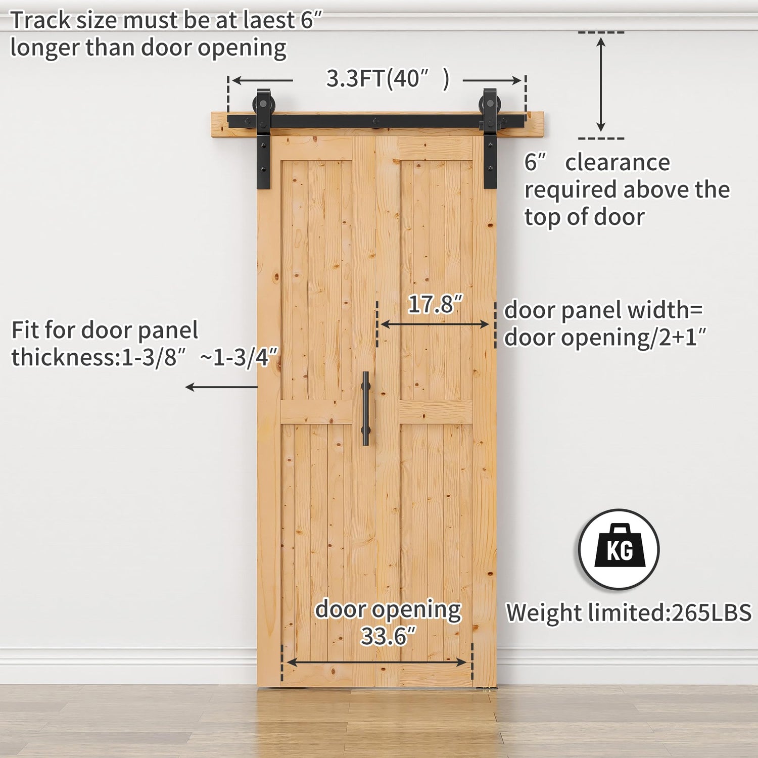 - [Barn Door Size] Height: 84", Width: 36" (18" X 2 Assembly-Free Doors), Thickness: 1-3/8", Adaptable To 40" Folding Barn Door Hardware Kit(Barn doors and hardware included)