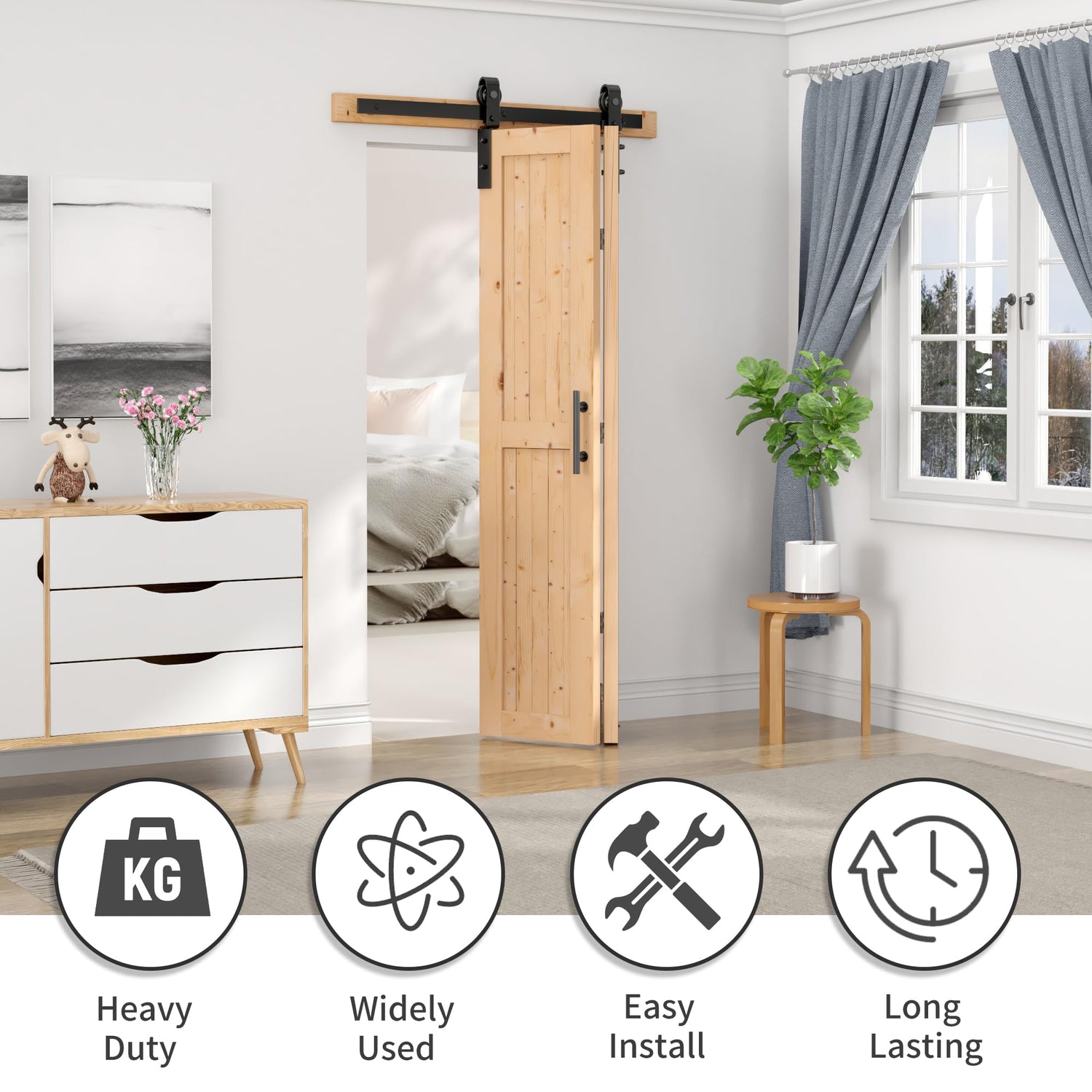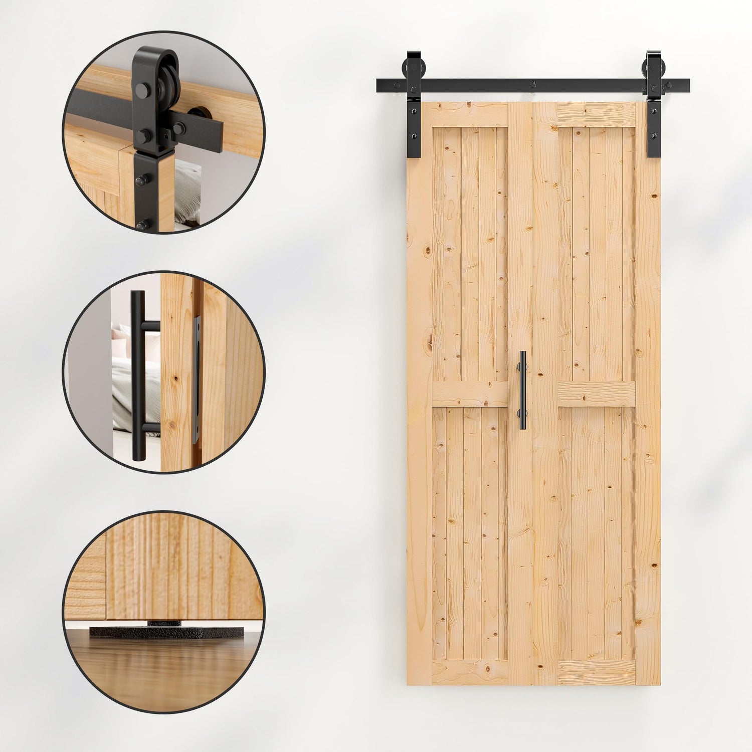 - [Spruce Wood] The barn door panels are crafted from high-quality spruce wood that features straight and even grain with original beauty. Through multiple processing, the doors are not easy to deform and crack, and have good corrosion resistance