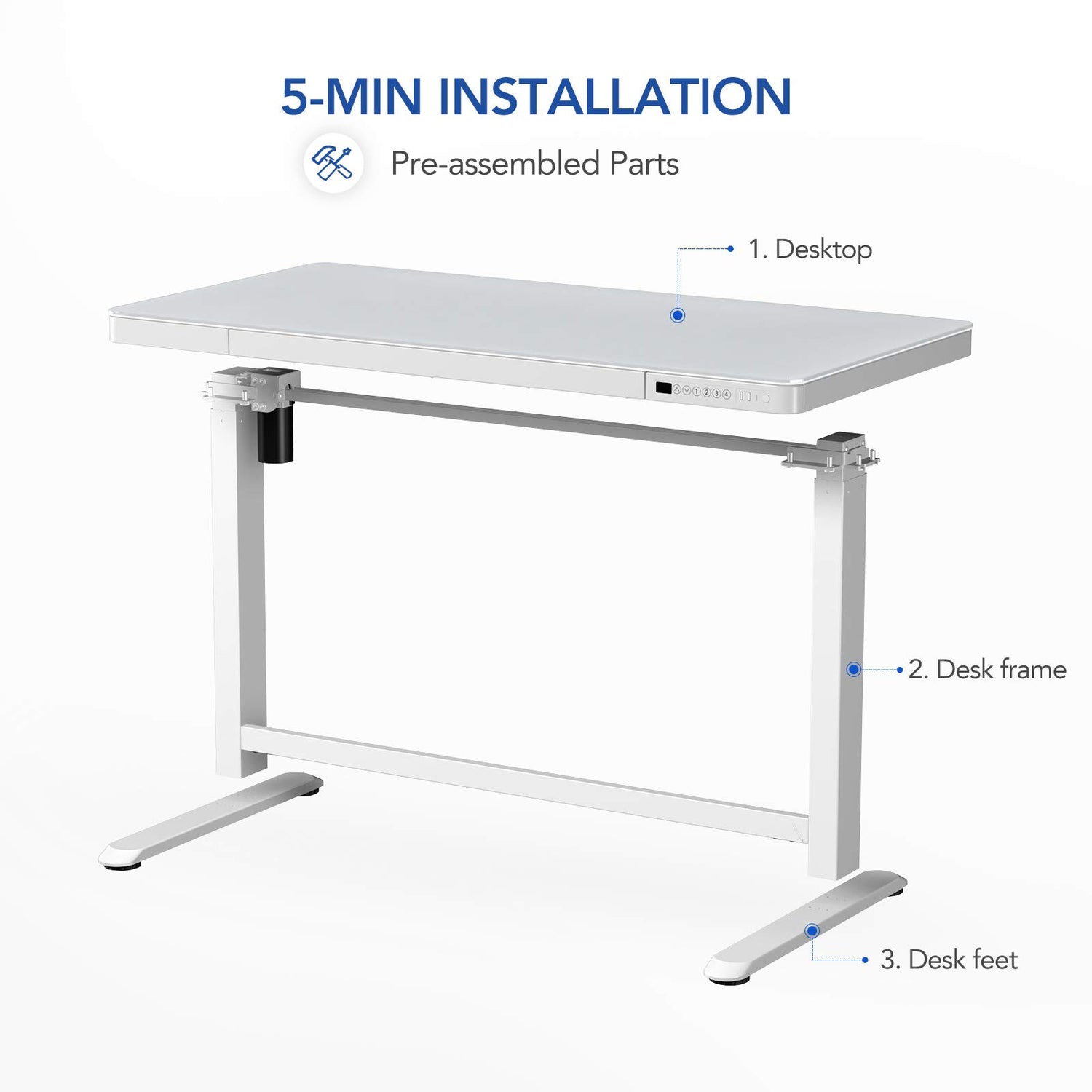 - Electric Height Adjustment: Switch from sitting to standing in seconds! Our standing desk features a robust motor that enables smooth, easy transitions from 28.3" to 47.6"(with 2.6” thickness of table top included) with the press of a button.