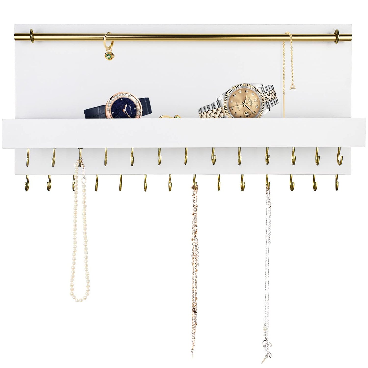SANY DAYO HOME 27 Hooks Wall Mounted Necklace Holder 14 x 6 inch Hanging Rustic Wooden Jewelry Organizer with Removable Bracelet Rod and Shelf for Kids, Girls, Women - Ivory White