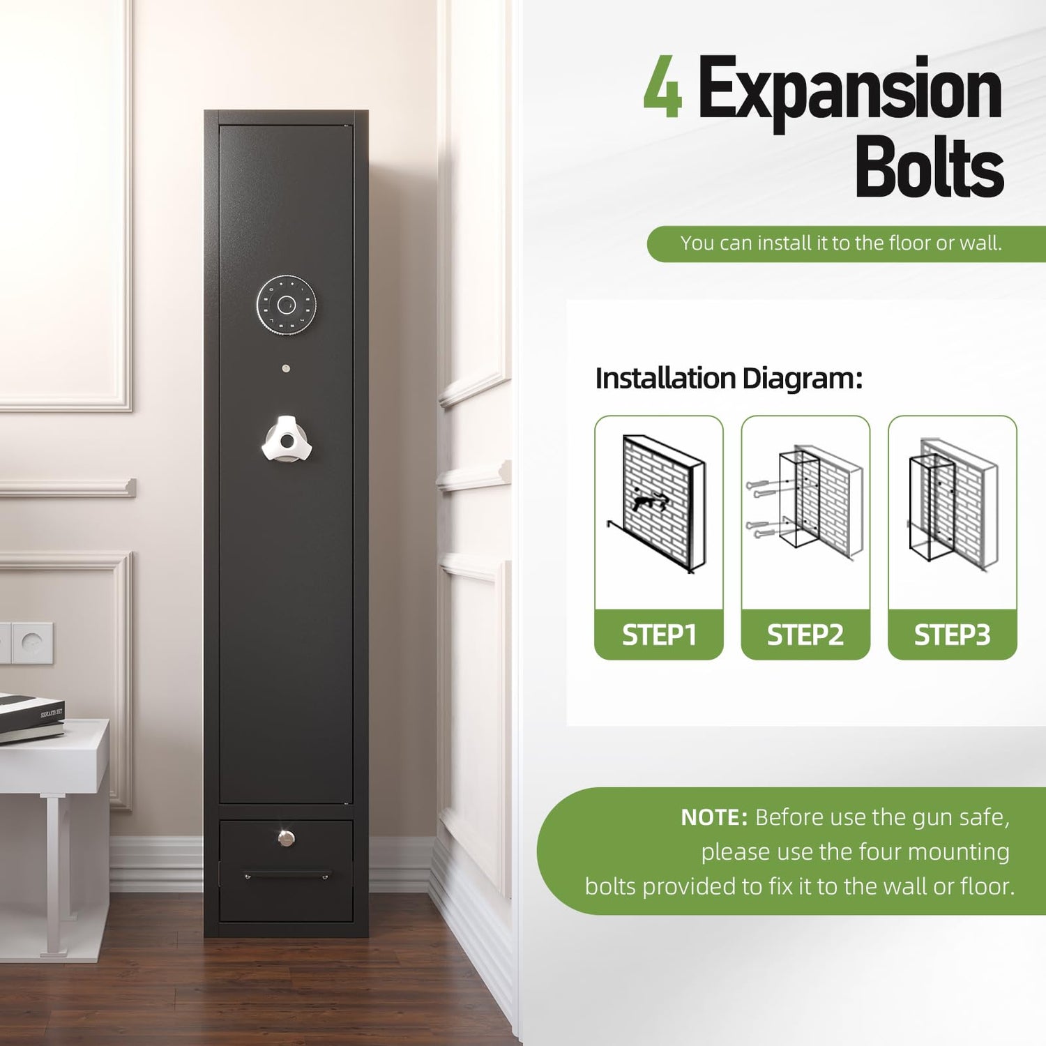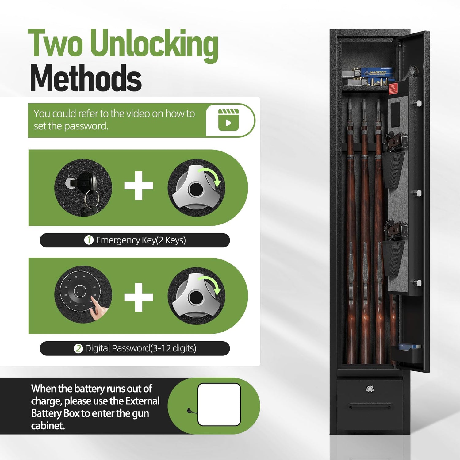 - [Electronic Gun Cabinet]: 3-8 digit code can effectively prevent unauthorized access to the gun cabinet. This rifle safe can set two set of password. When the battery is exhausted, Please use the key or the external battery box to access the gun cabinet. Note: Need 4xAA batteries, batteries are not included. Please do not lock your keys inside the gun cabinet)