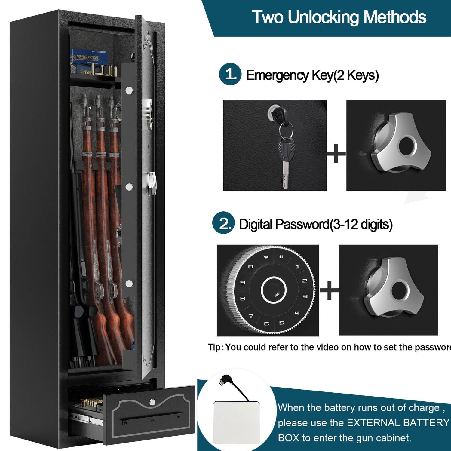 - 【Electronic Rifle Gun Safe】: 3-8 digit code can effectively prevent unauthorized access to the gun cabinet. This gun safe can set two set of password. When the battery is exhausted, Please use the key or the External Battery Box to access the gun cabinet. Note: Need 4xAA batteries, batteries are not included. Please do not lock your keys inside the gun cabinet)