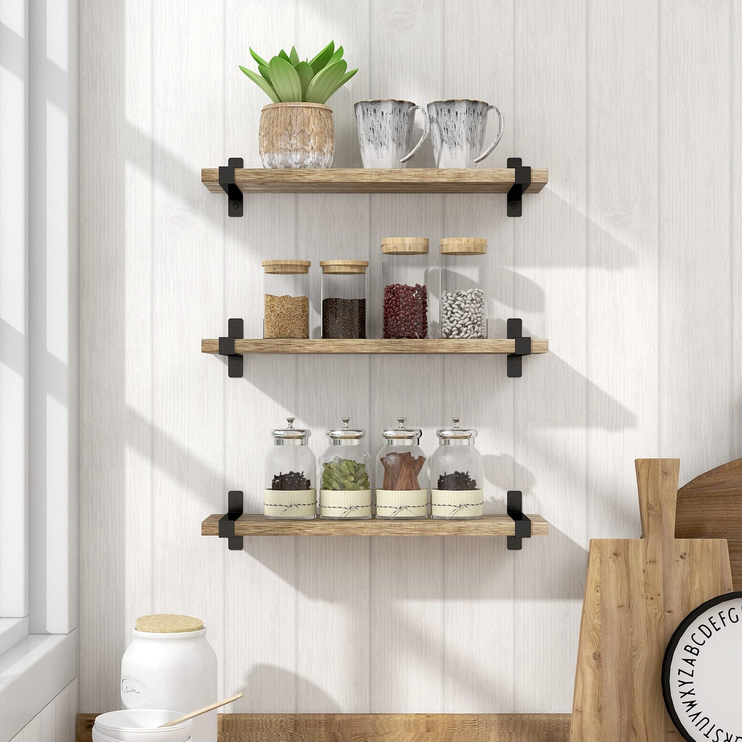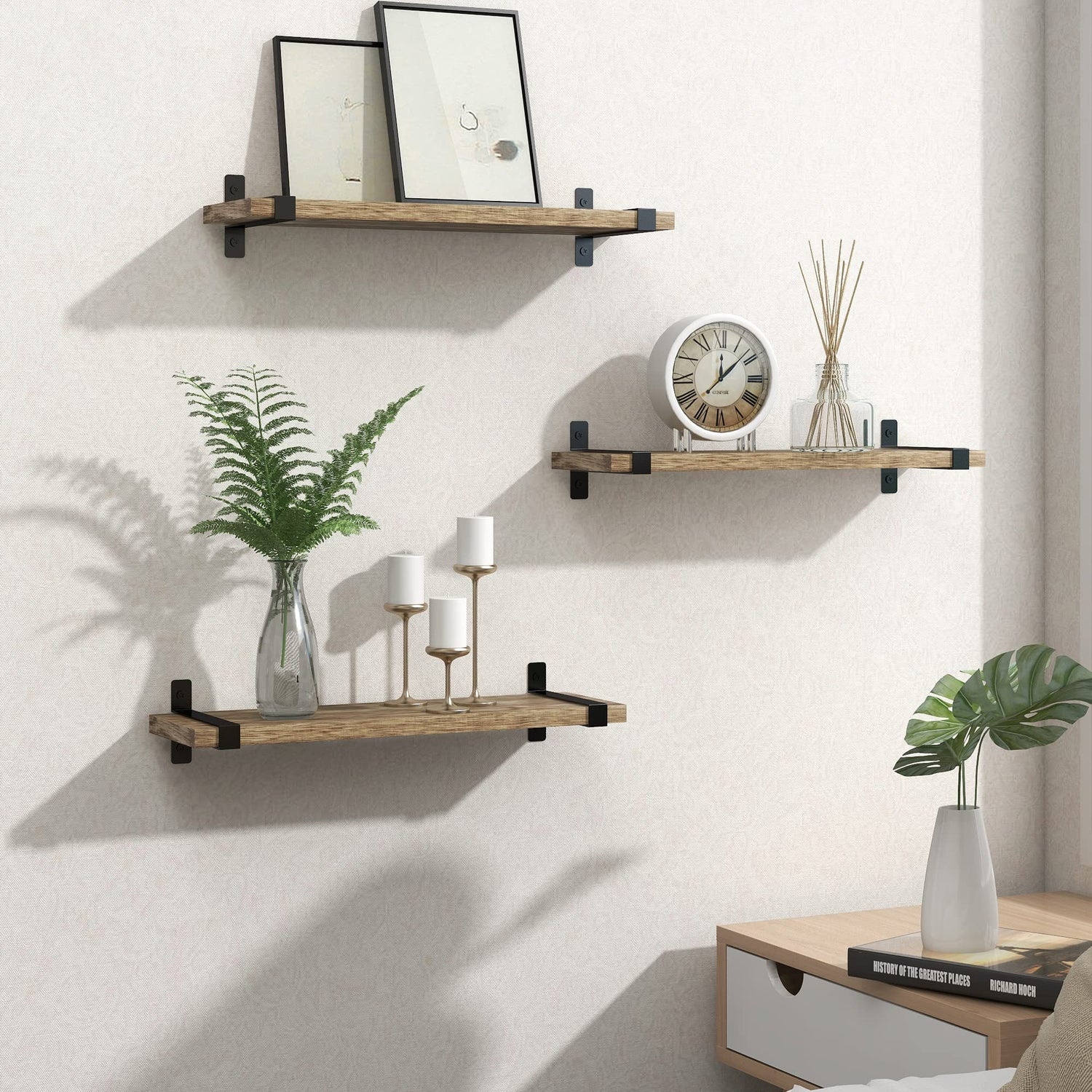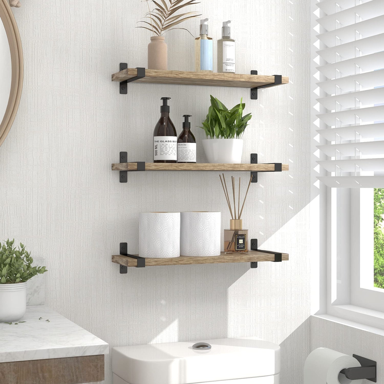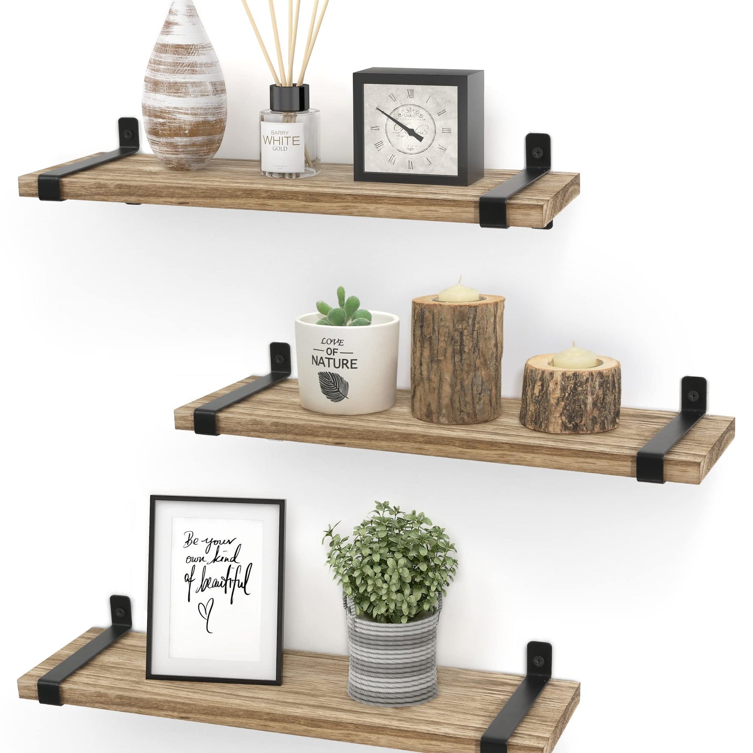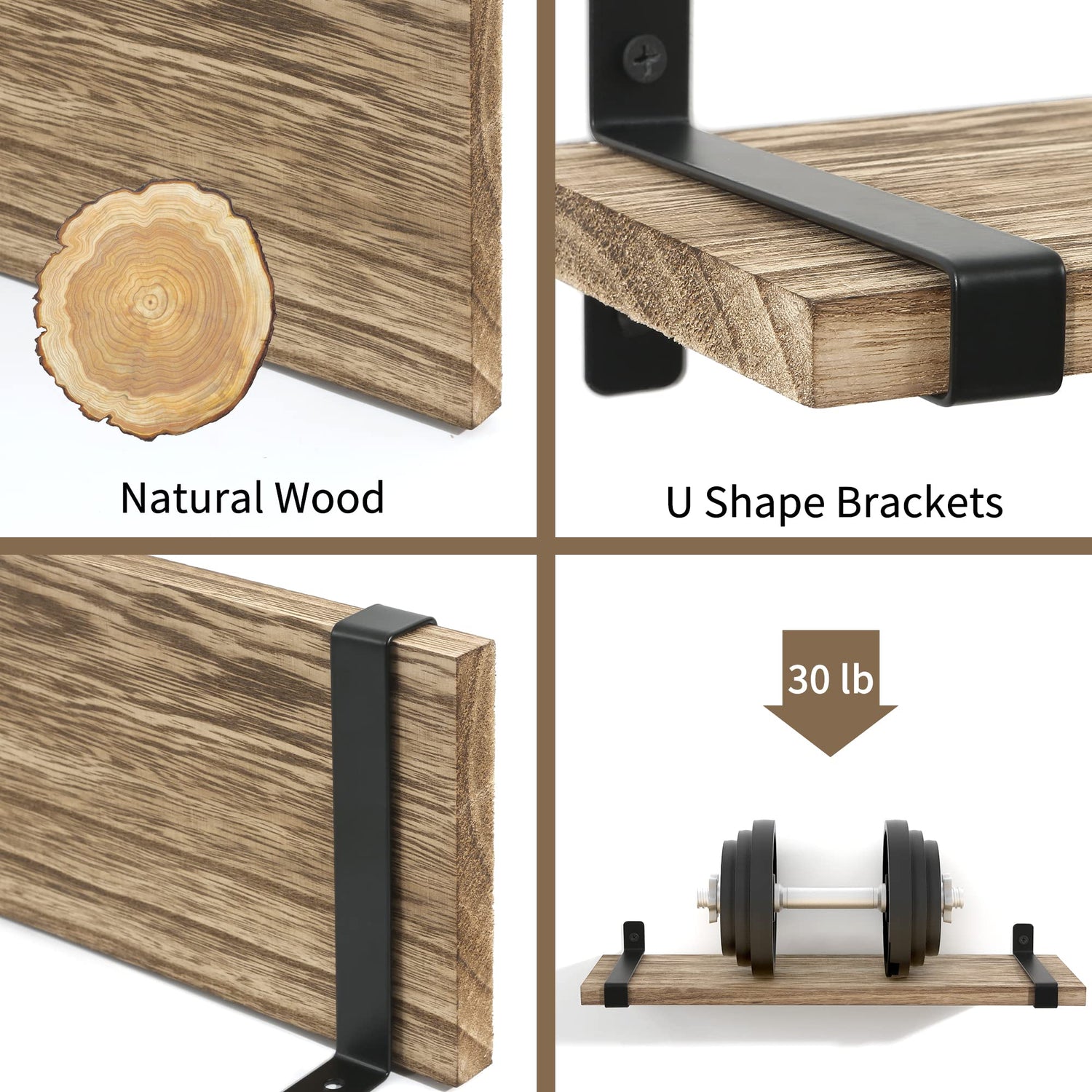 - 【Rustic Floating Shelves】Shelves made of carbonized wood with U-shaped brackets are perfect for a classic rustic modern farmhouse style home. An exquisite decoration in bathroom, living room, kitchen, bedroom, corner or office.