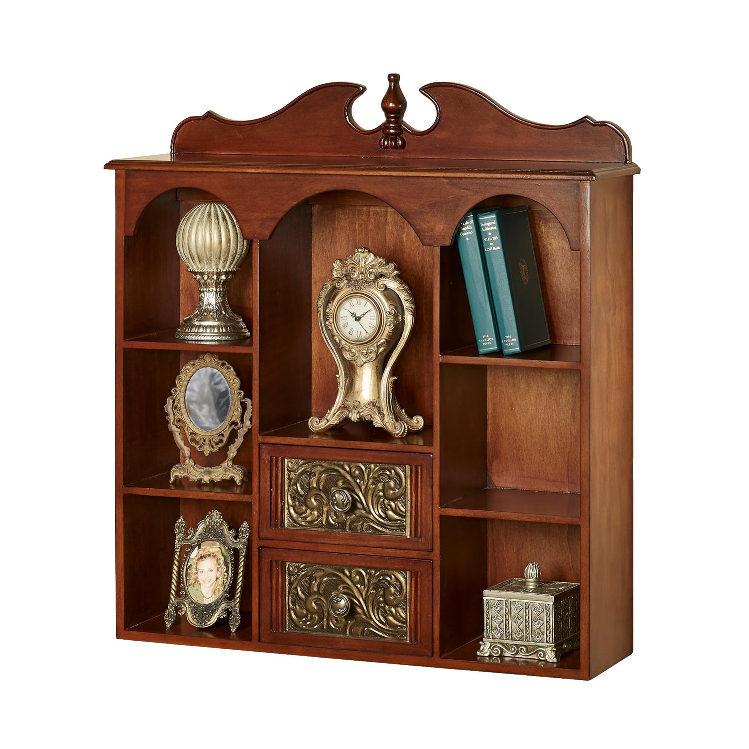 - ⚜️ SOPHISTICATED CRAFTSMANSHIP ⚜️ - Created and curated exclusively for you, we have ensured a storage accent with both style and foundation quality. This wooden wall curio has a natural cherry finish and metal ornate medallion designs finished in aged gold with black highlights. Curio has seven shelves and two drawers for your items.