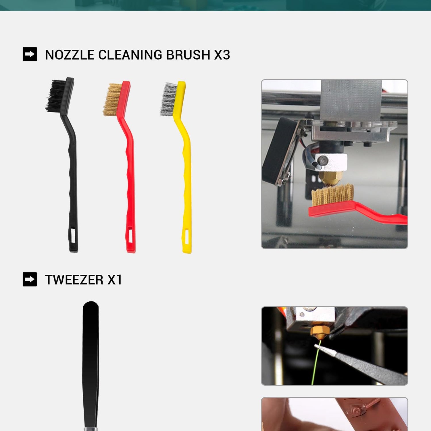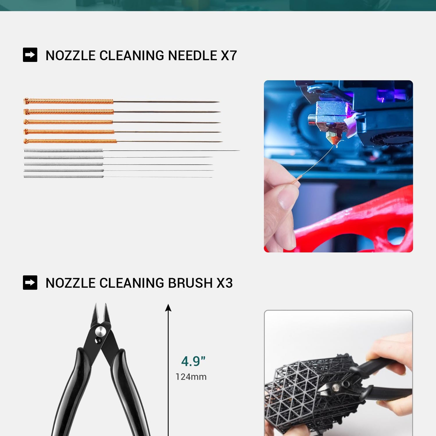- 【Professional 3D printer Tools】7Pcs nozzle cleaning needles of different specifications can quickly clear clogged nozzles, along with cleaning brush, filament pliers and cutting plate to help you complete 3D printing work, extend the life of the printer.