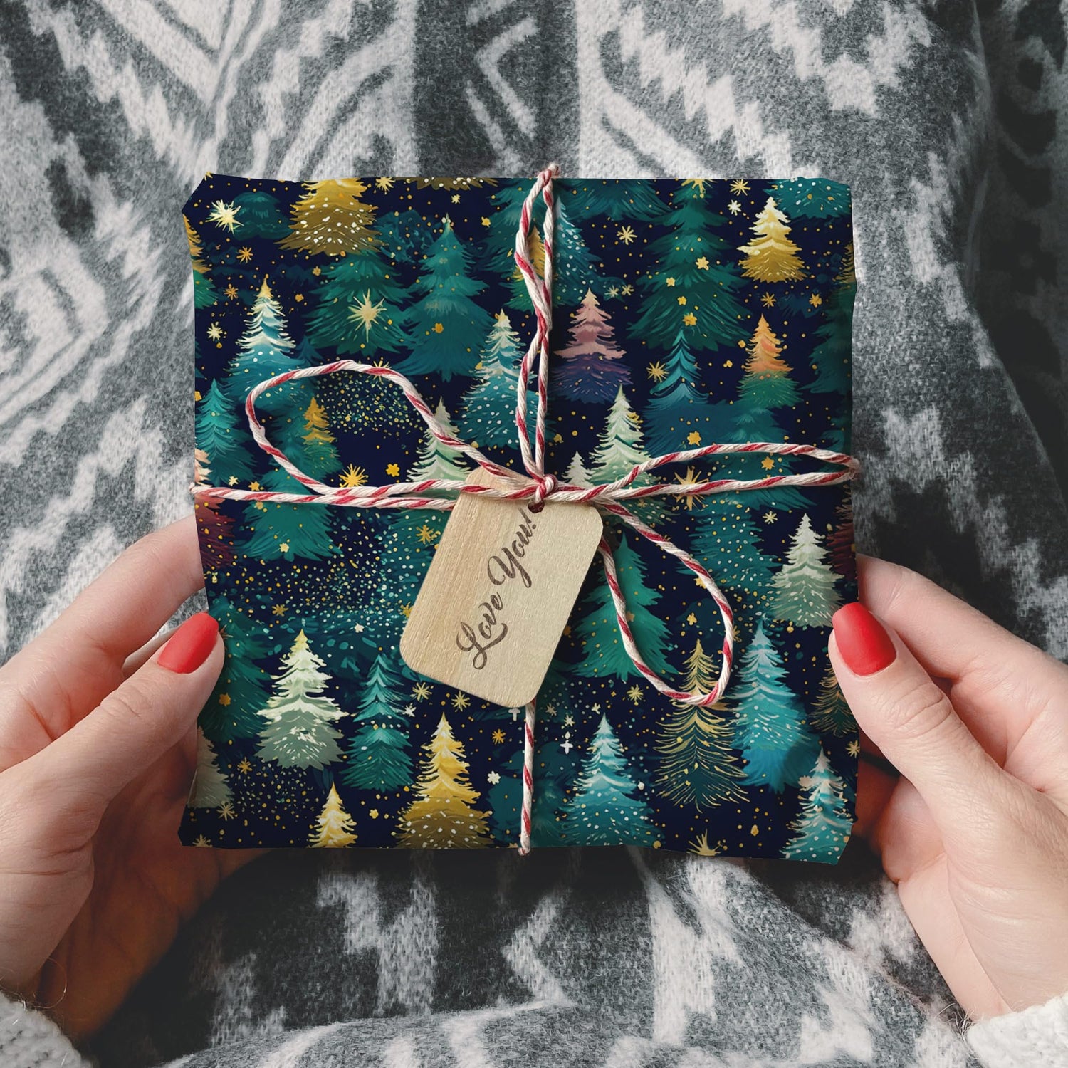 - Colorful Tree Designs: our Xmas wrapping paper features colorful Christmas trees set against a starry night sky. The vibrant colors, intricate details, and magical atmosphere create a visually appealing and festive design