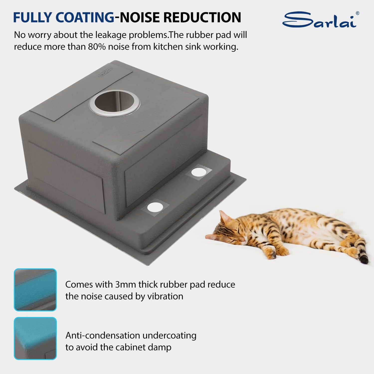 - Excellent Design: This stainless steel 15 inch bar sink has an anti condensation coating and a 3mm thick noise reducing rubber pad, which can prevent condensation water caused by temperature changes from damaging the cabinet and reduce usage noise. The bottom is designed with an X-shaped water guide line for quick cleaning and complete drainage.