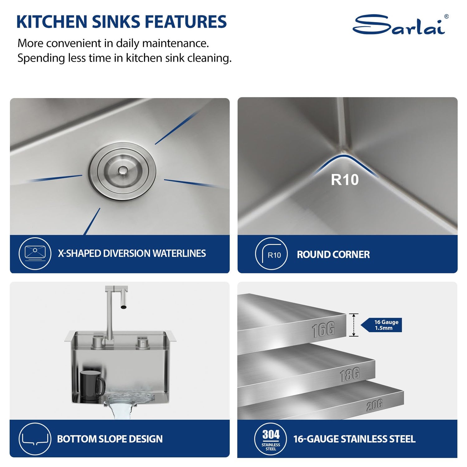 - Heavy Duty Bar Sink: Sarlai 15'' stainless steel bar / prep kitchen sinks are constructed with 16 gauge thick grade T304 stainless steel, durable and long lasting. Commercial grade brushed finish to make the sink scratch resistance.