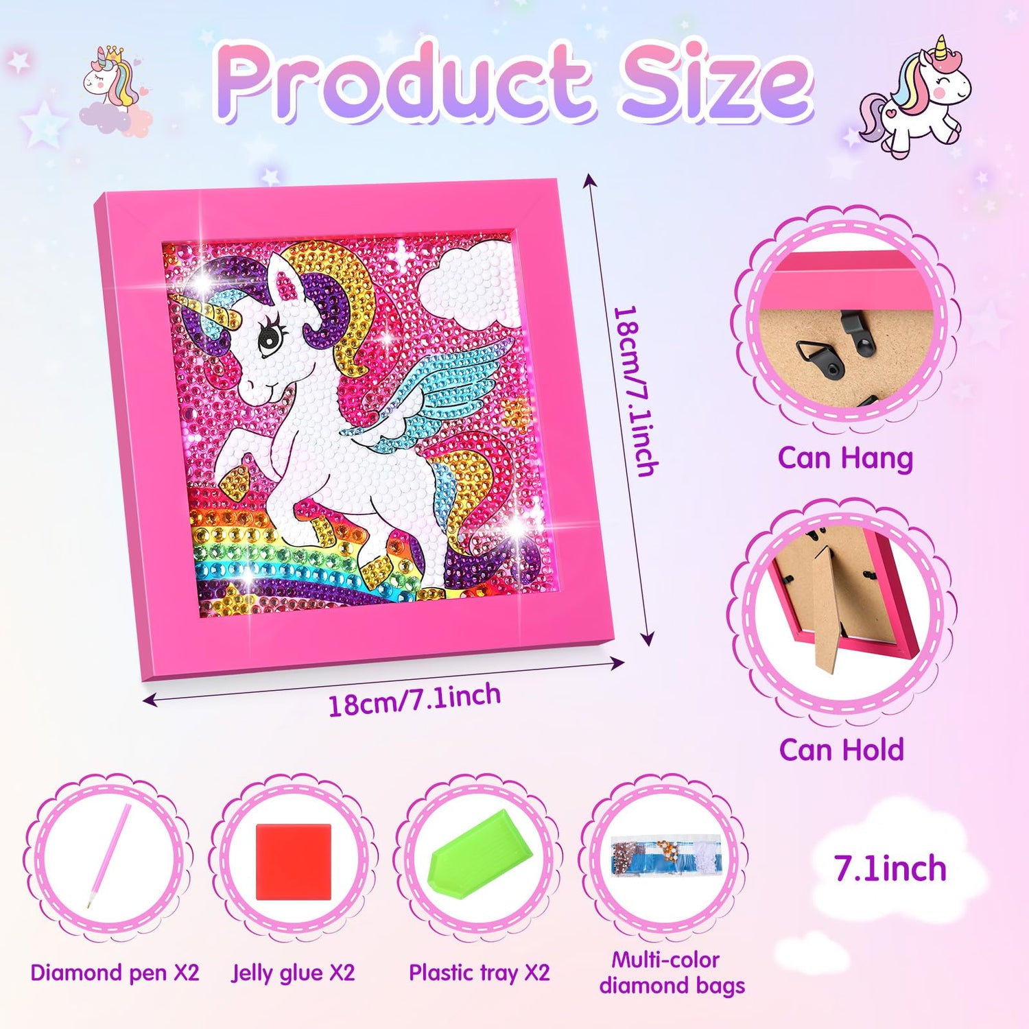- Unicorn Painting Kits: you will receive 1 piece of pink unicorn painting kit for kids, including a diamond canvas, a crystal diamond bag, a pointed drill pen, jelly dots and a tray, and a size of 7.1 x 7.1 inch/ 18 x 18 cm wooden photo frame, which is a great DIY craft for children
