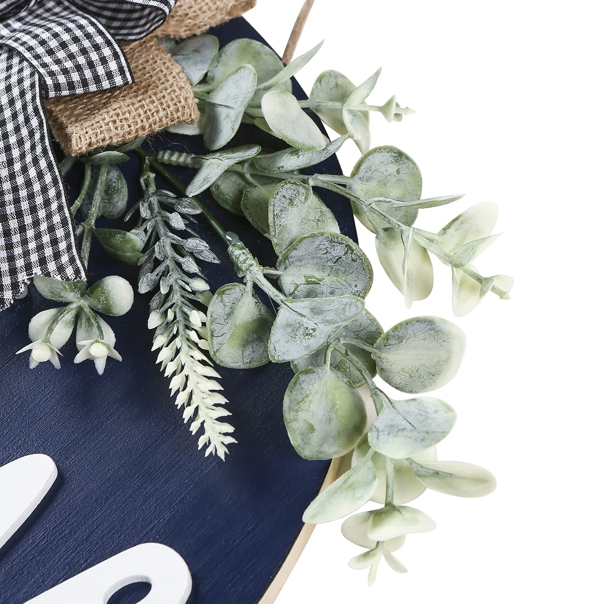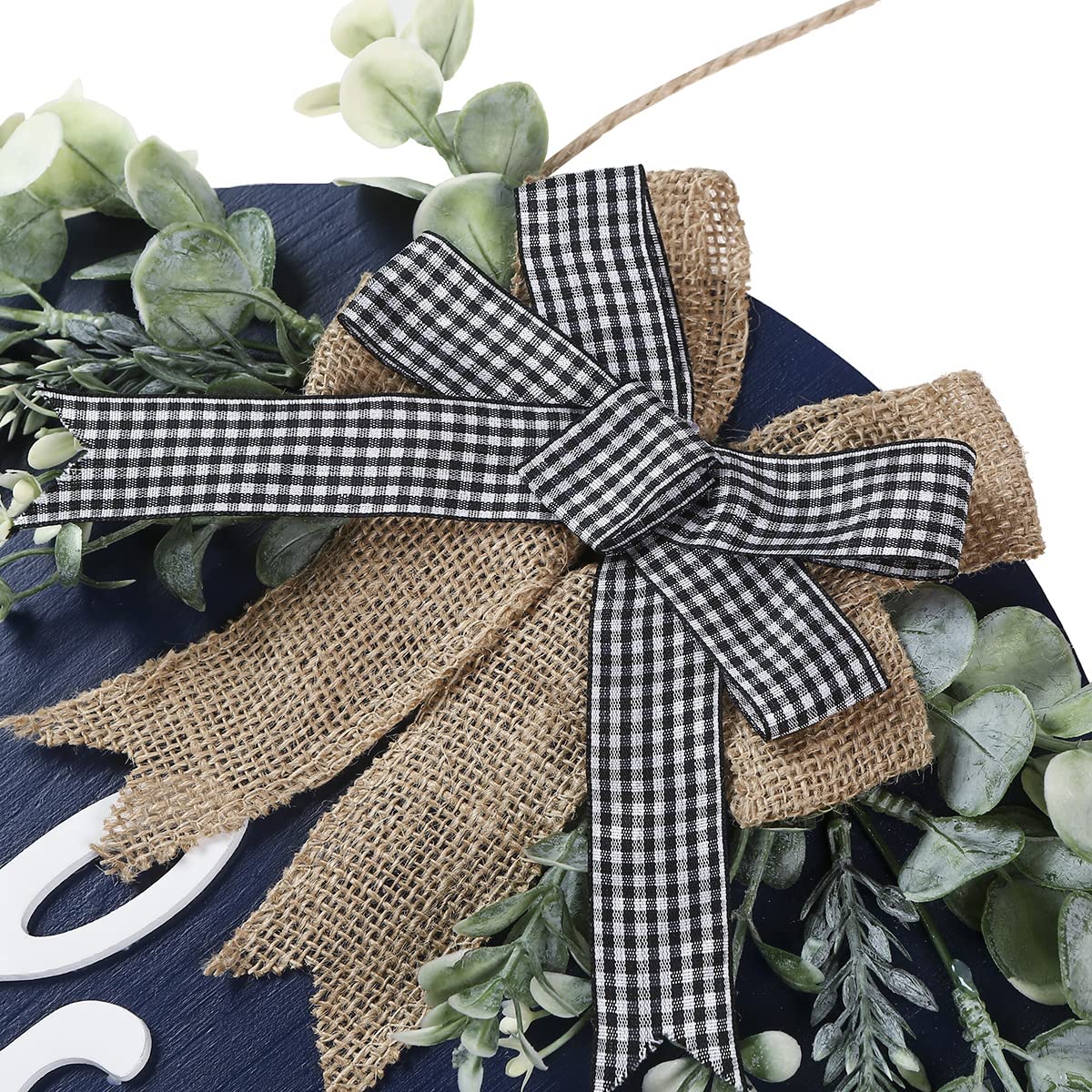 - MATERIALS: The round welcome wreath is made of durable wood with artificial plastic eucalyptus leaves and flowers, burlap bows and rope