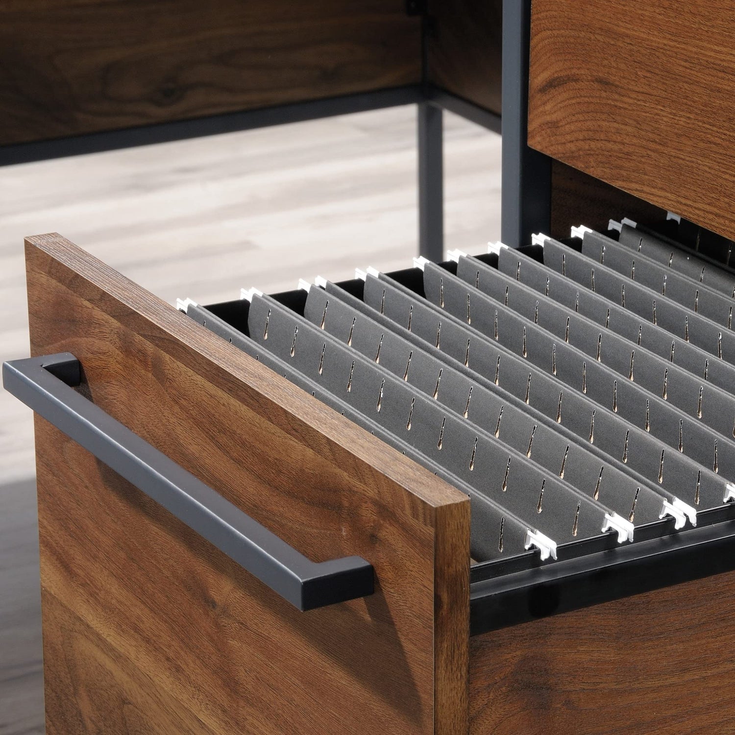 - Enhance the look of your office with this 59-inch Sauder Nova Loft L-shaped desk. The wooden legs offer strength and stability, while the 3 drawers let you keep your laptop, files and frequently used items tucked away. Sturdy engineered wood offers durability. This Sauder Nova Loft L-shaped desk features cable management grommets to help keep your workspace tidy, and the grand walnut finish delivers a mid-century modern touch.