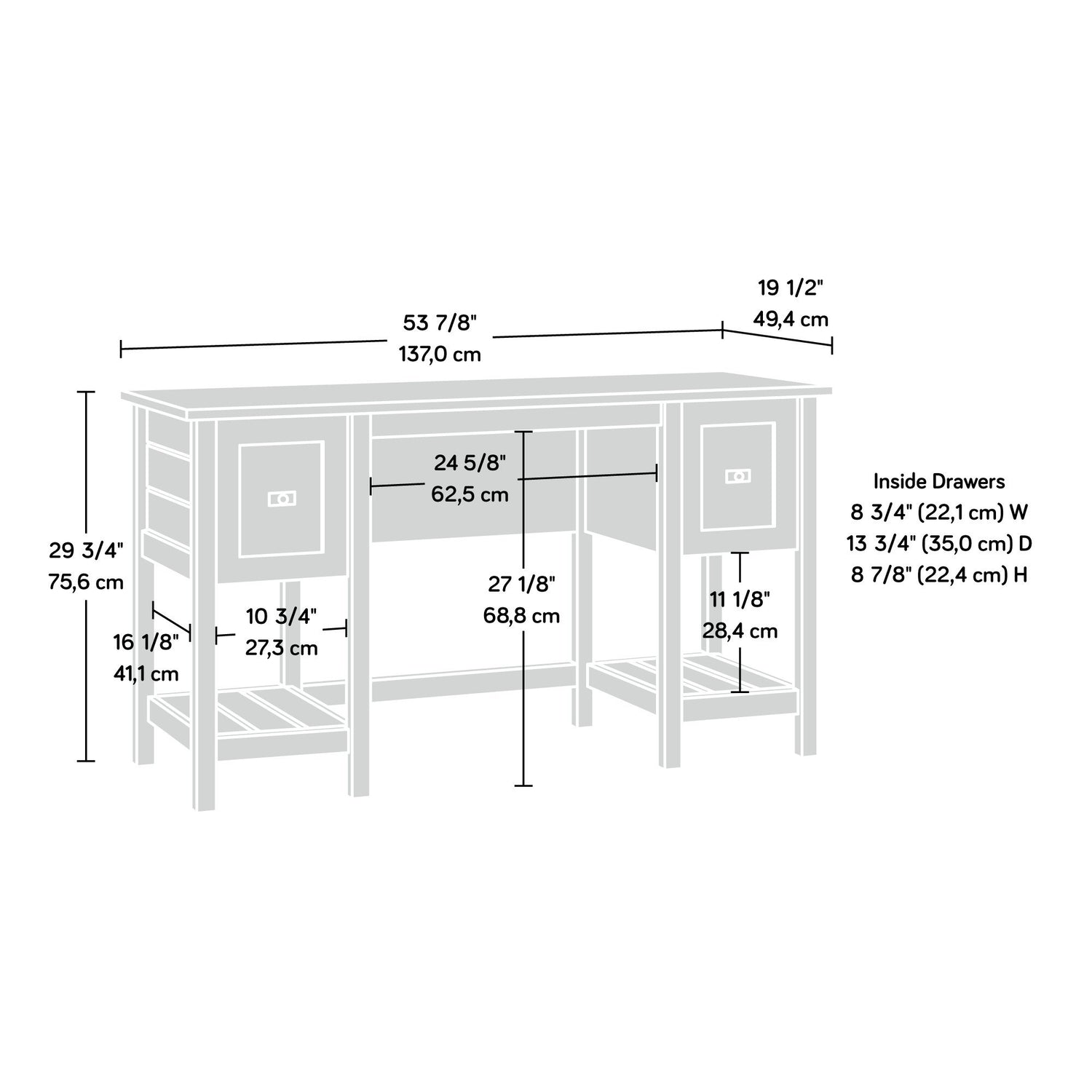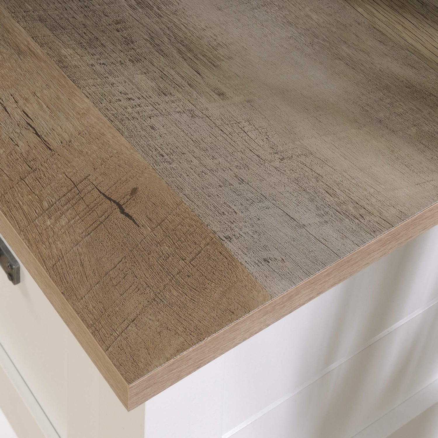 Details: Clean, elegant, and bright. Transform your office space with this desk from the Cottage Road collection. Its spacious work surface provides you with room for all your office essentials. It features two drawers will full extension slides and two lower shelves for additional storage. The file drawer holds letter-size hanging files to keep you organized. Finished on all sides in Soft White with a Lintel Oak accent, this versatile desk will look good no matter where it stands.