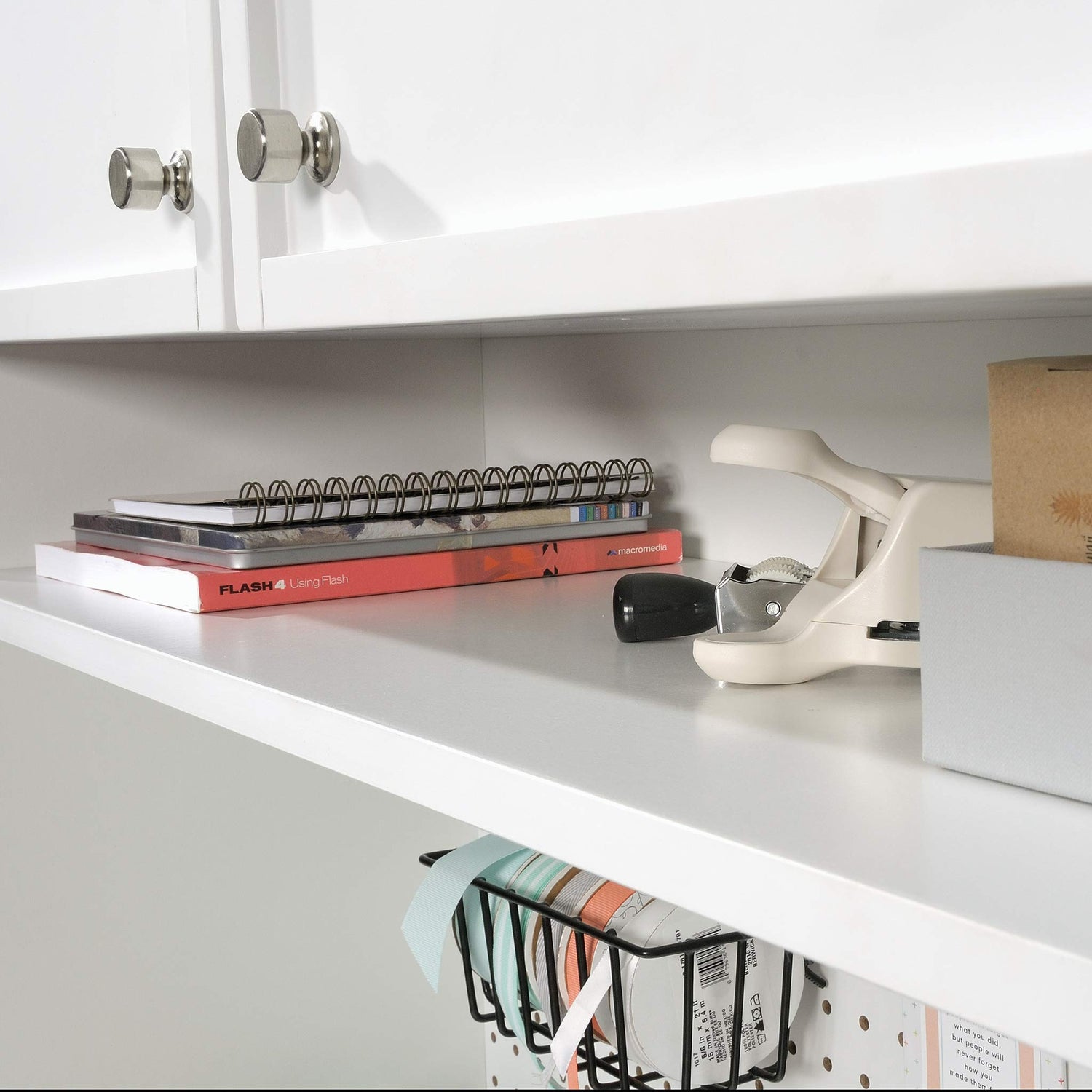 Details: Need some extra storage for all your crafting and sewing supplies? Check out this handy hutch from the Craft Pro Series®. This storage hutch attaches to Storage Cabinet 421405, Storage Cabinet 421407, or Craft Table 421417 to add extra storage and display space for your crafting project necessities. This craft cabinet hutch features an adjustable shelf behind the doors for customizable storage space for yarn, books, paper, and more. An open shelf is ideal for easy-access storage to your stapler, scissors, or tape. A pegboard back on this craft furniture allows convenient and visible organization of tools and supplies. Cord access through the enclosed back make this craft storage hutch the must-have addition to the Sauder furniture that you already know and love. Finished in a crisp White, this hutch for craft table is the perfect addition to keep your hobby and craft space clean and organized.