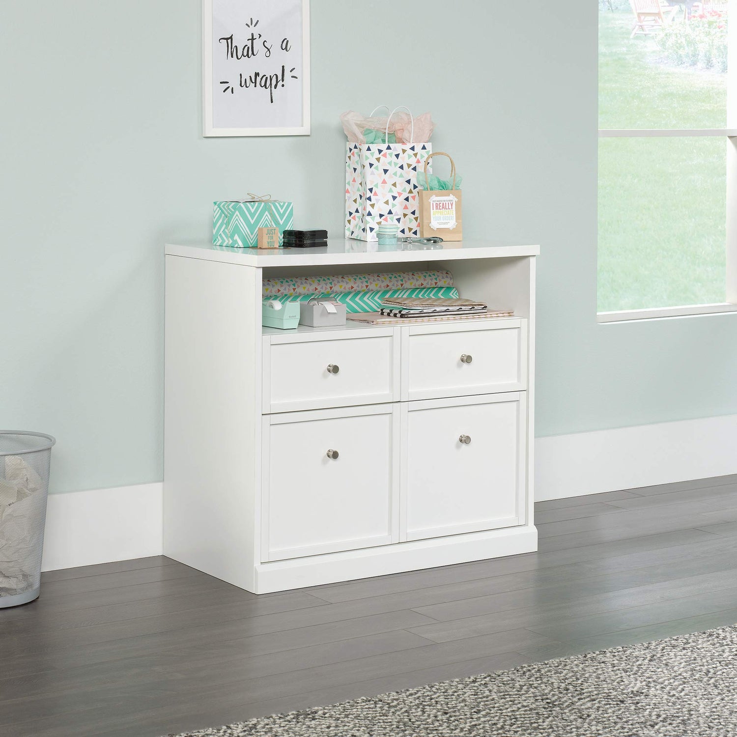 Details: Scrapbook paper, scissors, and stamps – store it all in this storage cabinet from the Craft Pro Series® collection. This craft cabinet features four easy gliding drawers with full extension slides for storage of yarn, construction paper, and other crafting tools. An open shelf allows for easy access storage of all your crafting materials. This craft storage cabinet also includes a melamine top surface that is resistant to heat, stains, and scratches, so you can craft without any worry. Use the top surface of this storage cabinet for crafting for your latest project, home décor, or photos of your family. Finished in White, this sleek 4-drawer storage cabinet is the perfect solution to all your storage needs. We hope you like what you see. Sauder designers travel the world and bring back the best and latest in style, finish, and color trends. This inspiring world travel is evident in the cutting edge and innovative furniture solutions we offer to you!
