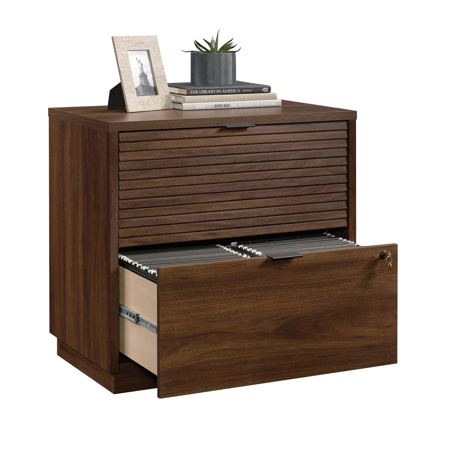 Details: Looking for a solution for your unorganized mess of papers? Look no further! Create the additional storage space your home office needs while adding the style that you love with this lateral file cabinet from the Englewood® collection. This 2 drawer file cabinet features two large drawers with full extension slides that can hold letter or legal size hanging files so you can have a place for all your important documents. The patented, interlocking safety mechanism only allows one drawer to open at a time for extra safety precautions. The drawers also lock for secure storage options. The upper drawer features a louver detailed front for an extra touch of style that is sure to stand out. The top features a strong and lightweight 1" panel construction and offers a spacious surface to store and display different things like decorative plants, a wireless printer, work binders, and framed photos of your family. Finished in Spiced Mahogany™, this good-looking wood lateral file cabinet will have you feeling organized in no time!