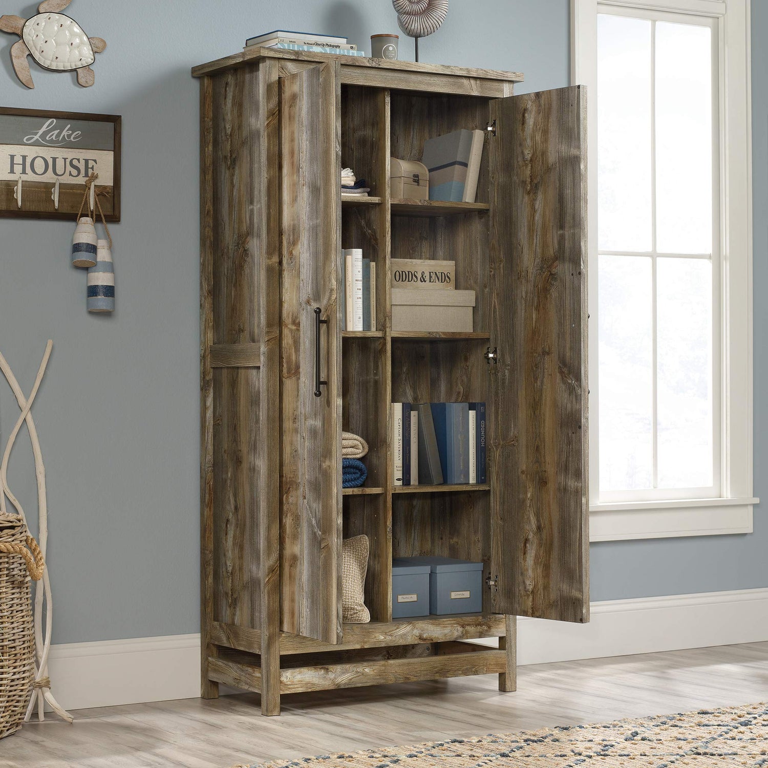 Details: Style and storage all in one! Give your home the additional storage options it needs without having to sacrifice on the style you love with this rustic storage cabinet from the Granite Trace® collection. Behind its two large doors is a spacious hidden storage area that includes six adjustable shelves that have the ability to move to different heights to create flexible storage for items of all shapes and sizes. These versatile shelves are ideal for storage of a variety of different items like spare blankets, stacks of shirts, board games and so much more! You can find a spot for all your things. It's stunning style and versatile design make this storage cabinet a great addition to any room in your home – the living room, your office, or even the laundry room. It looks great no matter where it stands! Finished in Rustic Cedar and detailed with attractive hardware, this double door storage cabinet with shelves will have you feeling organized in no time.
