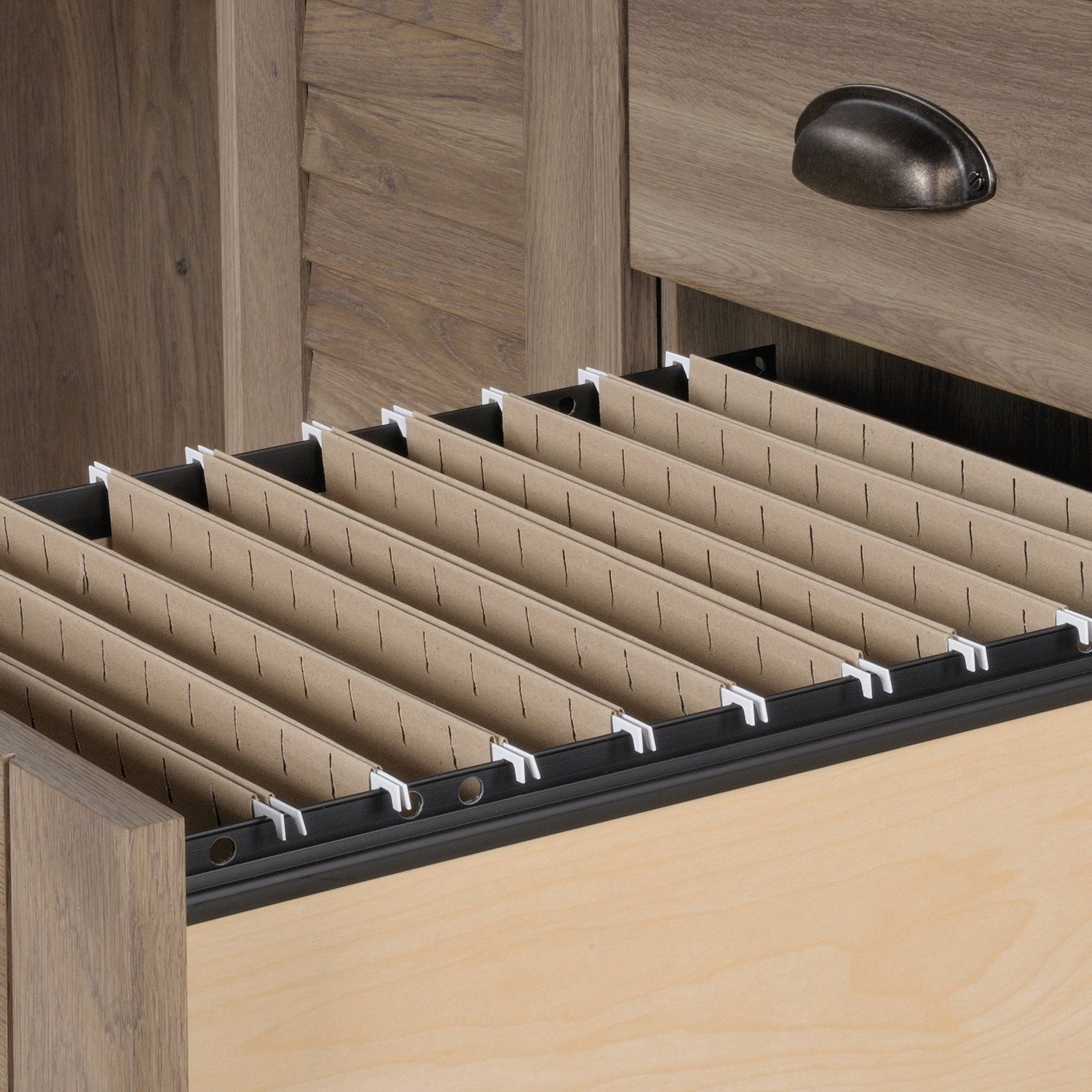 - Lower drawer with full extension slides holds letter, legal or European size hanging files to keep your important documents organized