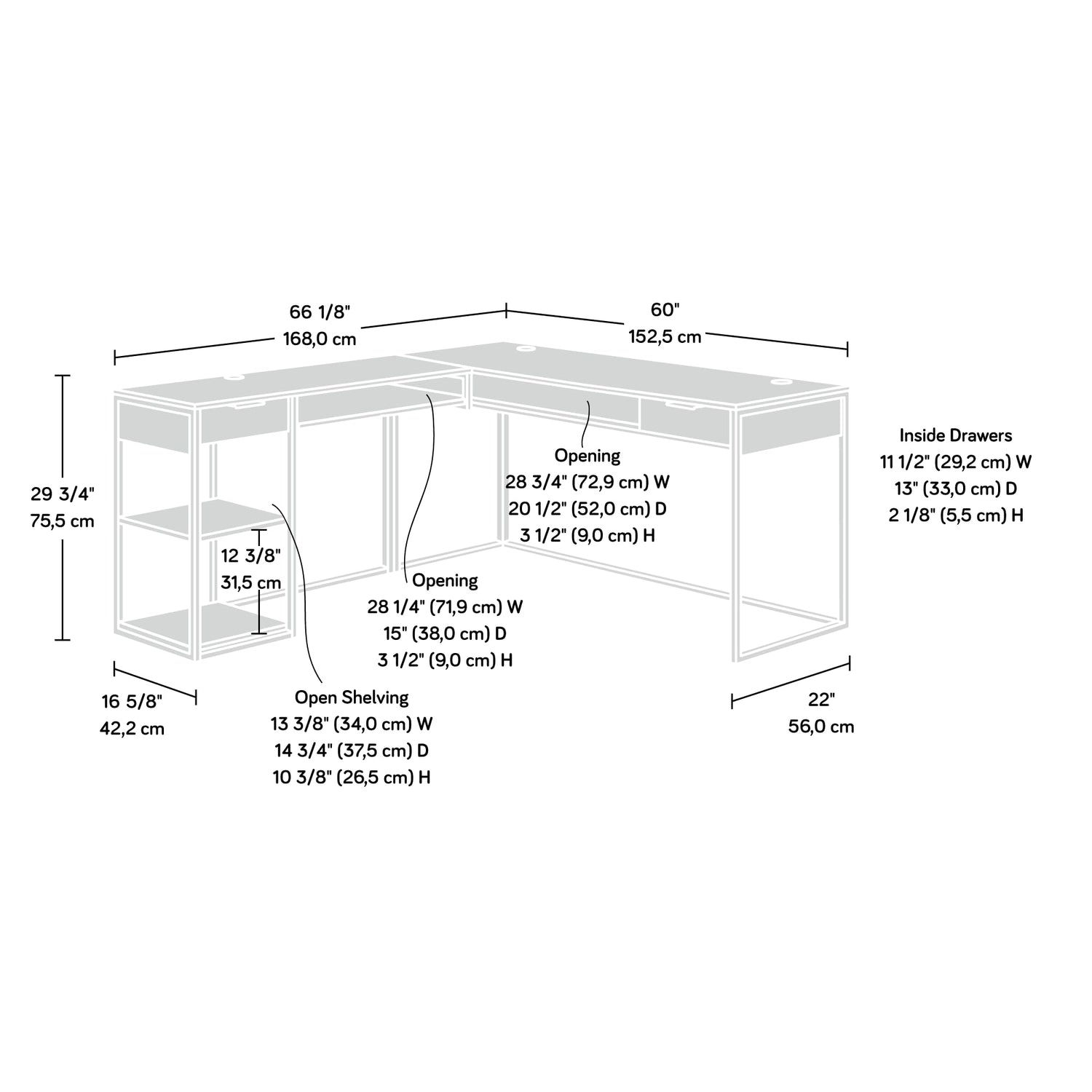 Sauder International Lux Modern L-Shaped Desk, L: 65.98" x W: 60.0" x H: 29.72", Umber Wood finish