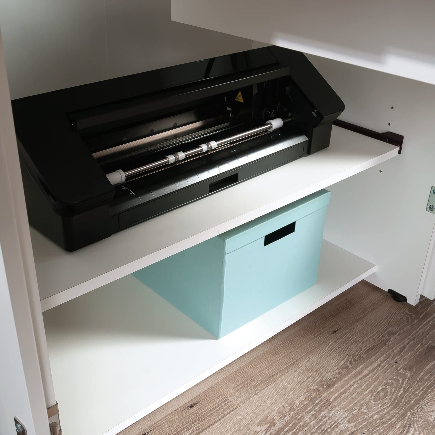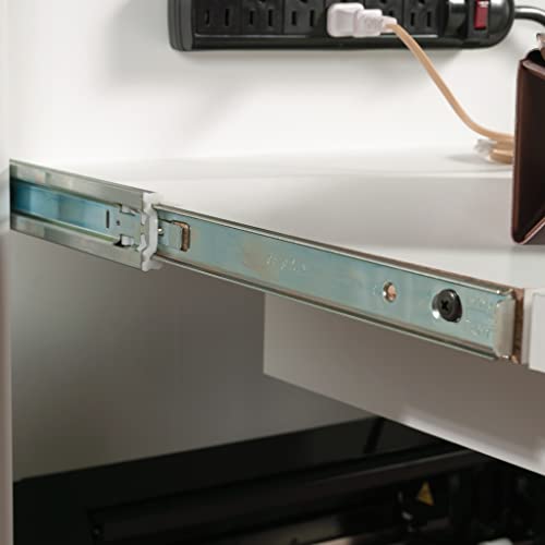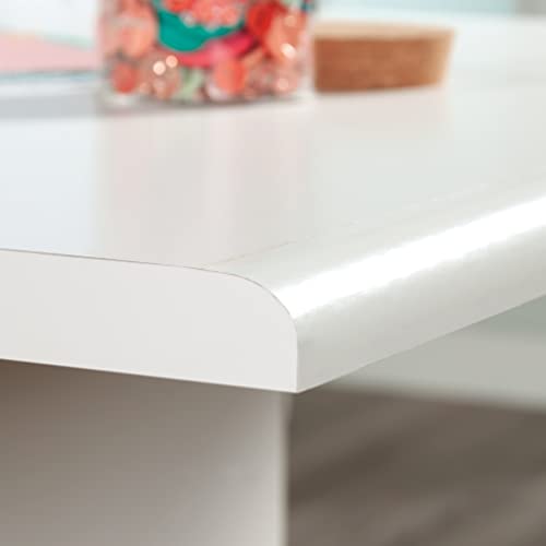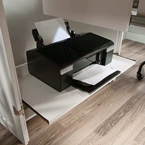 Details: Upgrade your crafting set up with this multi-purpose armoire from the Sauder Select collection. This craft armoire functions as the perfect place for your crafting materials, sewing supplies, or used in the home office for extra work space. This armoire with fold out table features a shelf with full extension slides and a drop leaf extension for ample workspace for doing crafts, coloring with family members, playing a board game, and more. The center shelf of this sewing armoire features a power strip with six outlets for convenient electrical access. Worrying about having enough outlets is a thing of the past. Six adjustable shelves allow you to customize your armoire with storage to your liking. A lower slide-out shelf features metal runners and safety stops for organizing bins, a printer, and more. Finished in a Soft White®, this office armoire brings organized functionality to the home office, craft room, or living room.