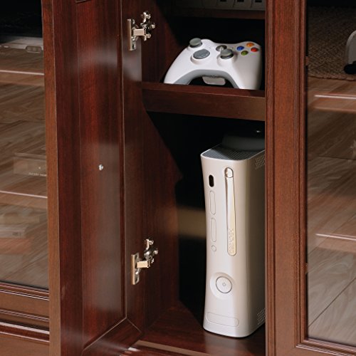 Details: Does it seem like your home is missing a little something? How about a touch of elegant style and beauty? Give your home just that with this credenza from the Palladia® collection. It accommodates up to a 70” TV, making it the ideal spot to catch your favorite shows, watch action packed films or play video games with your friends. Already have a TV stand? No problem – use this credenza’s spacious top surface as the perfect place to display all your favorite home décor and prized possessions like a stylish accent lamp, a vase full of flowers, fine dishes and knick-knacks too! It also features four framed doors that offer the option of easy-to-insert panels in either safety-tempered glass or wood so you can style it how you like. Behind each set of double doors is a spacious storage and display area that includes two large adjustable shelves that can be moved to different heights to create flexible options for items of all shapes and sizes. Behind the framed panel center door is a power strip for convenient storage of gaming components and equipment. It also features a cord management system so you can keep all your wires neat and out of sight. Finished in Select Cherry, this classy credenza is sure to give your home exactly what it needs.