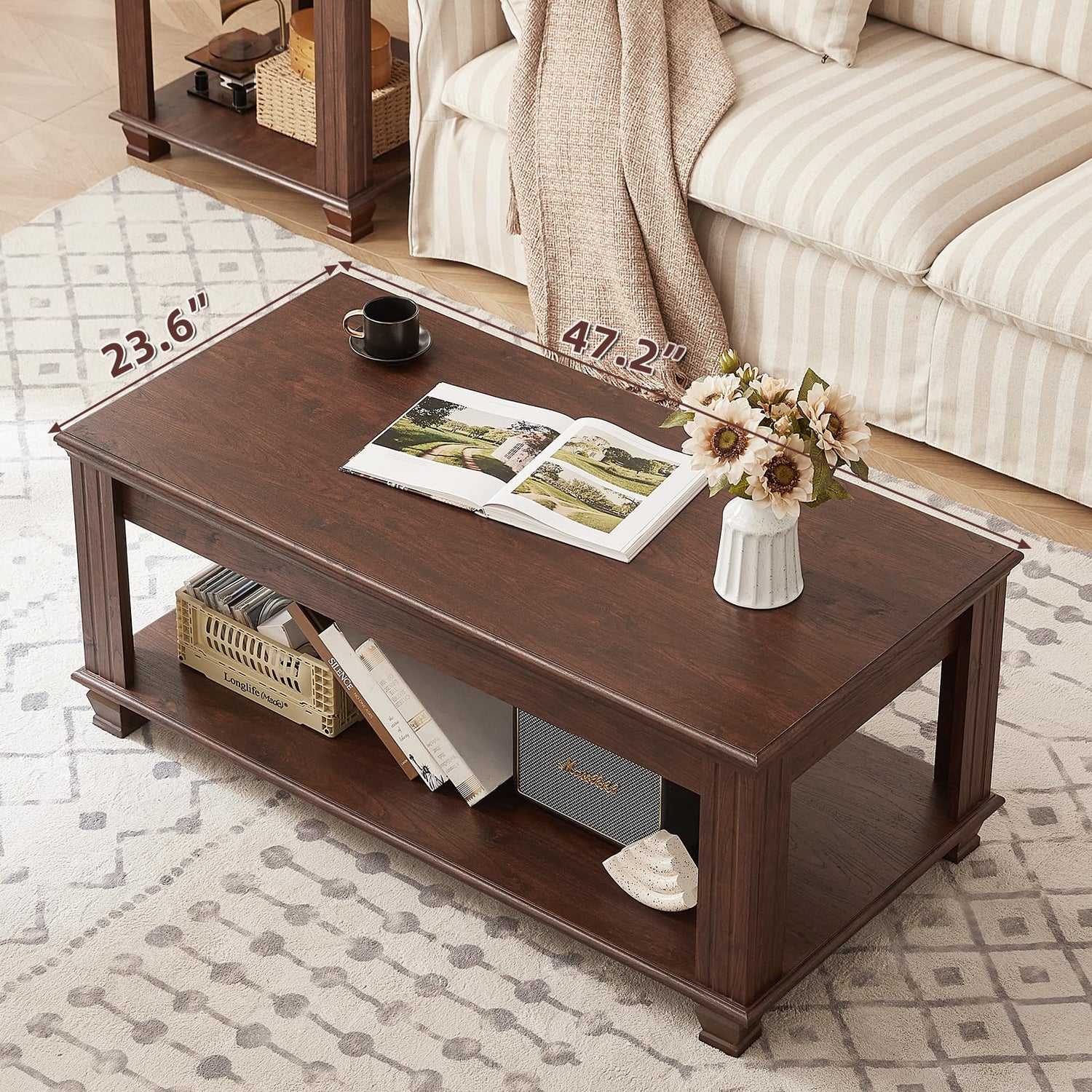 - [Spacious Storage Space]: Large modern Coffee Table Measuring:47.2" W x 23.6" D x 19.5" H. This rectangular coffee table with storage includes a spacious open storage level—great for organizing books, decorative baskets, or everyday essentials. Its functional design makes it an excellent choice for those looking for square coffee tables for living room spaces.