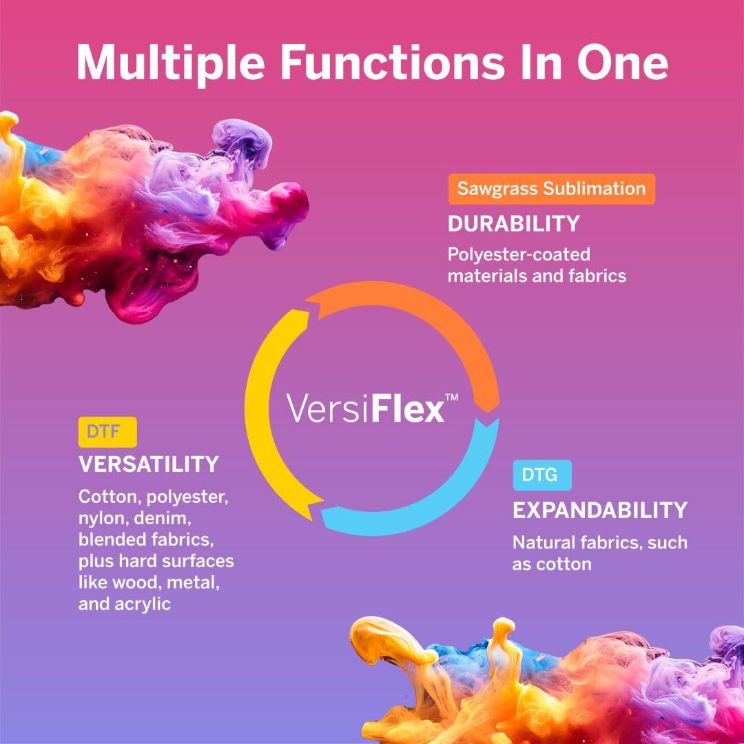 - Unleash Vibrant Colors & Soft Feel - VersiFlex Decoration Inks exclusively for the SG500 that deliver stunning, true-to-life colors with a soft touch. No more stiff, uncomfortable transfers for a professional finish - unlike DTF printing.