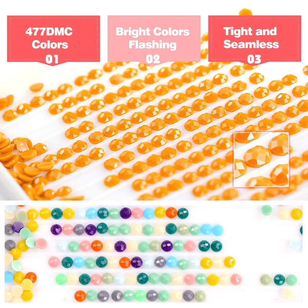 - Sparkle Diamonds: The diamond is made of environmentally friendly diamonds, full in color. Round Diamonds (upgrade of resin diamond) has a total of 477 colors, 26 cuts, high gloss, small fine seams, and flashing screen. Canvas high-definition color printing, moisture-proof thick oil canvas, anti-wrinkle and tear-proof, clear and easy to change symbols, one-piece without splicing, never fade.