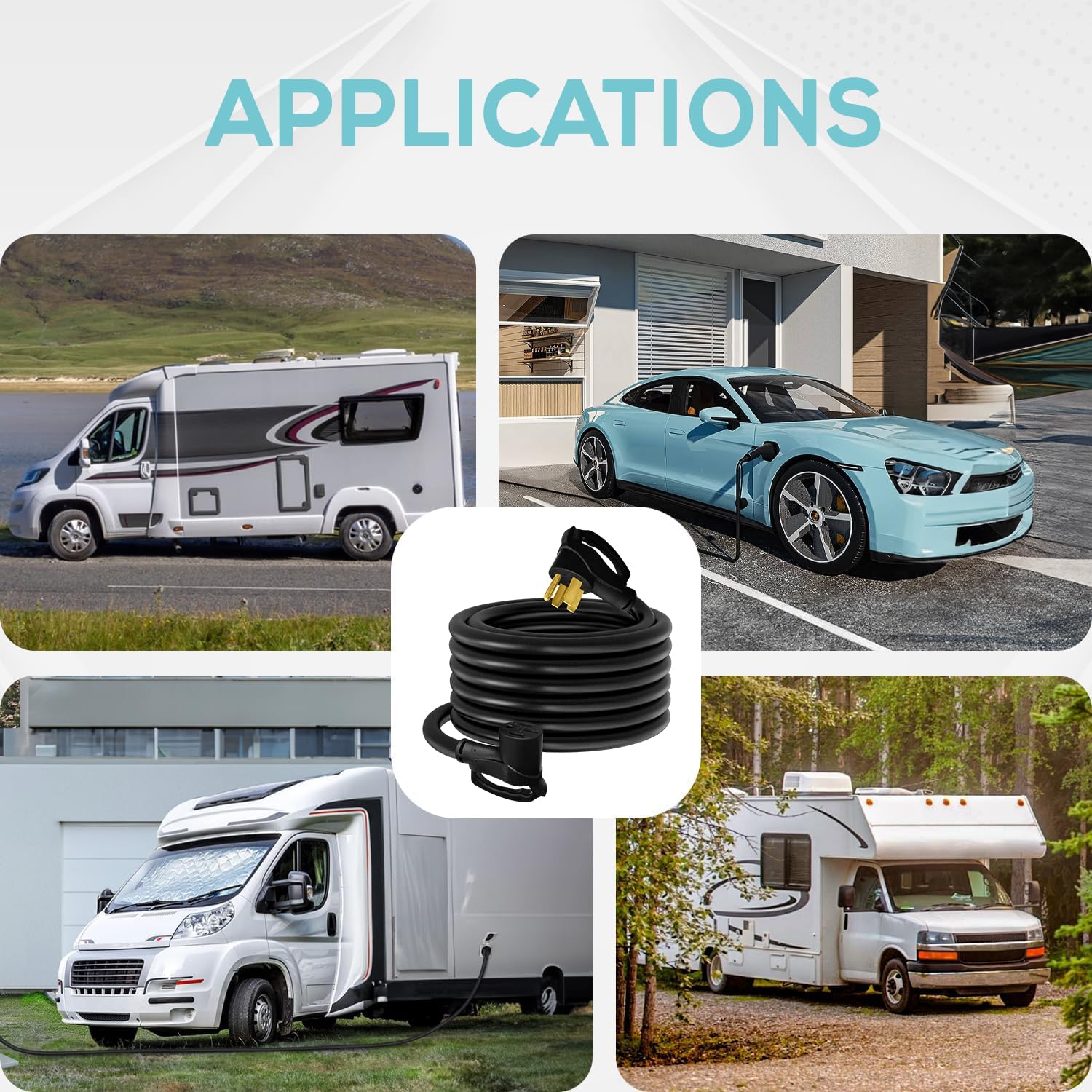- 【HIGH COMPATIBILITY】 50 Amp Extension cord 125/250 Volt compatible with the most electrical welders in the market, Electric Vehicles (EV), RV, generators, campgrounds, motor parks, mobile homes, and backup power.