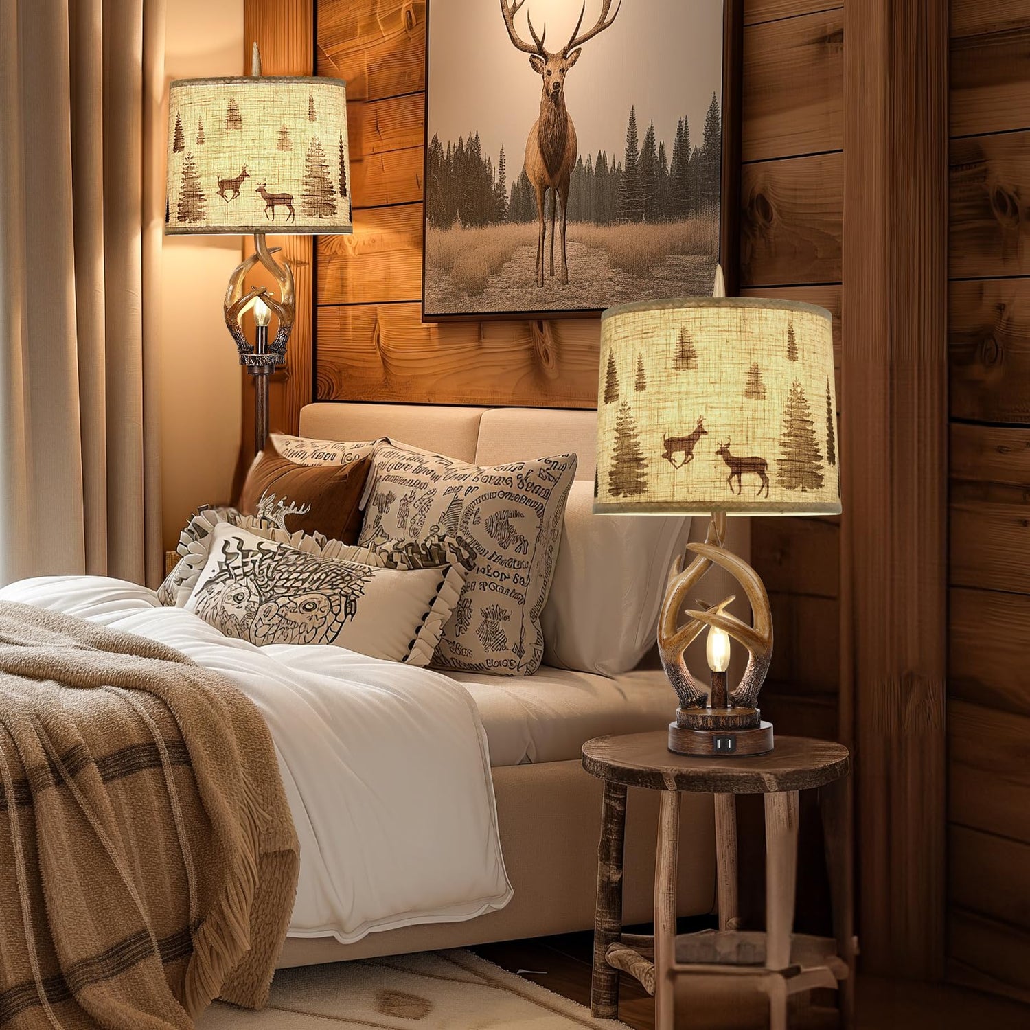 Scenekoy Rustic Farmhouse Antlers Table Lamp Set of 2 with Nightlight Dual USB Ports Linen Fabric Round Shade Bedside Lamp Decor for Living Room Bedroom Office House