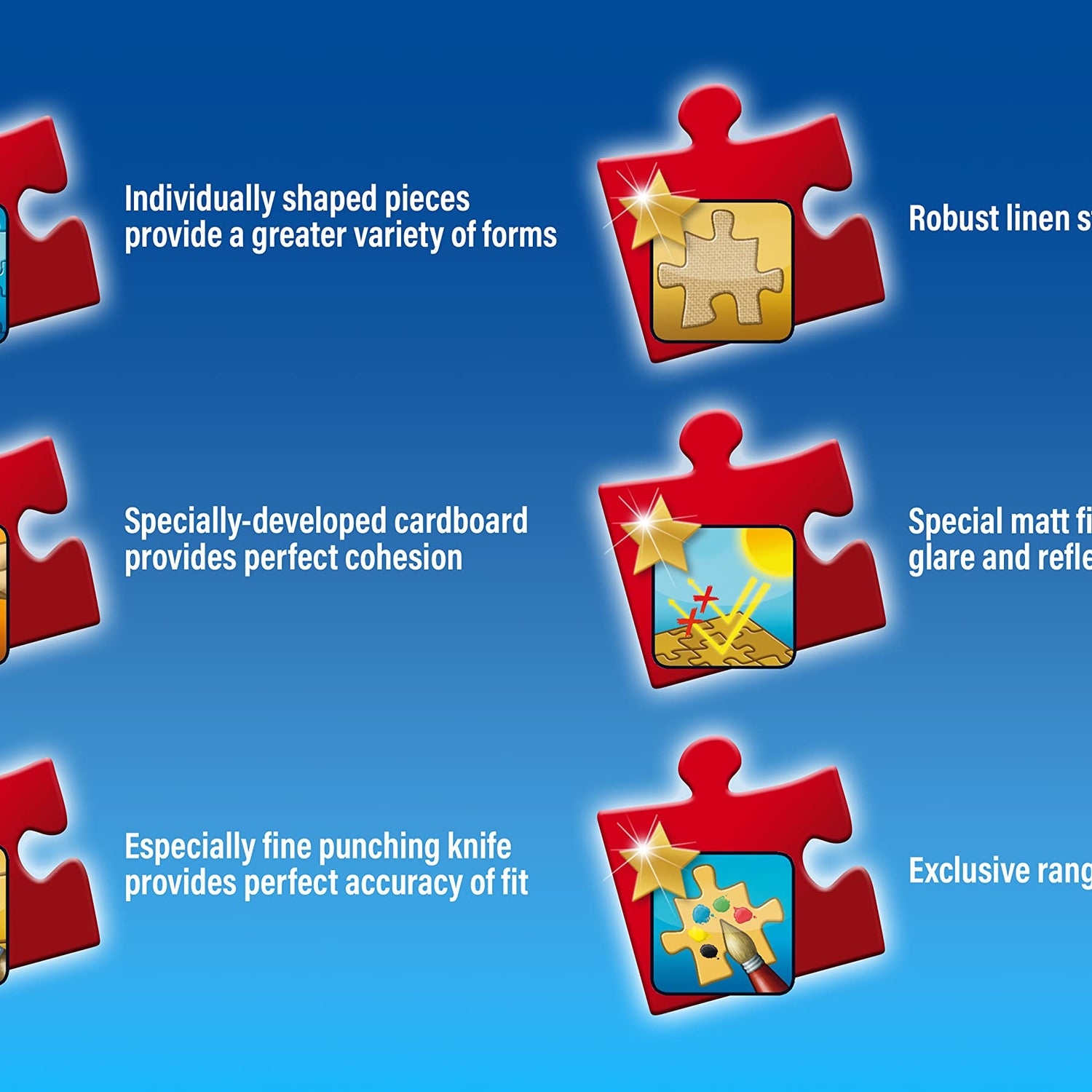 - Snug fitting, varied, thick and smooth-edged pieces.