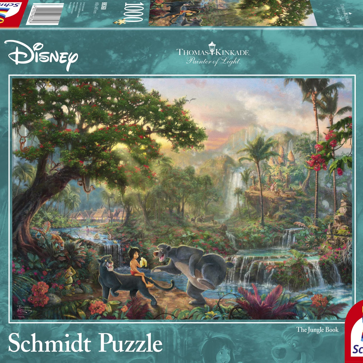 Details: Venture into the jungle with the man cub Mowgli and all your favourite characters from the Disney classic, The Jungle Book. The painter of light, Thomas Kinkade depicts the three friends Mowgli, Baloo and Bagheera in the magical jungle. Completing a puzzle from Schmidt Speile is a wonderful opportunity to find your inner calm and recharge your batteries as you piece together some iconic and timeless images. These puzzles are manufactured to a high quality and contain indivdually shaped pieces to provide greater variety, the special matte finish bansihes glare and minimises reflections, ensuring the puzzles are a delight to build. The complete puzzle measures: 693 mm x 493 mm.