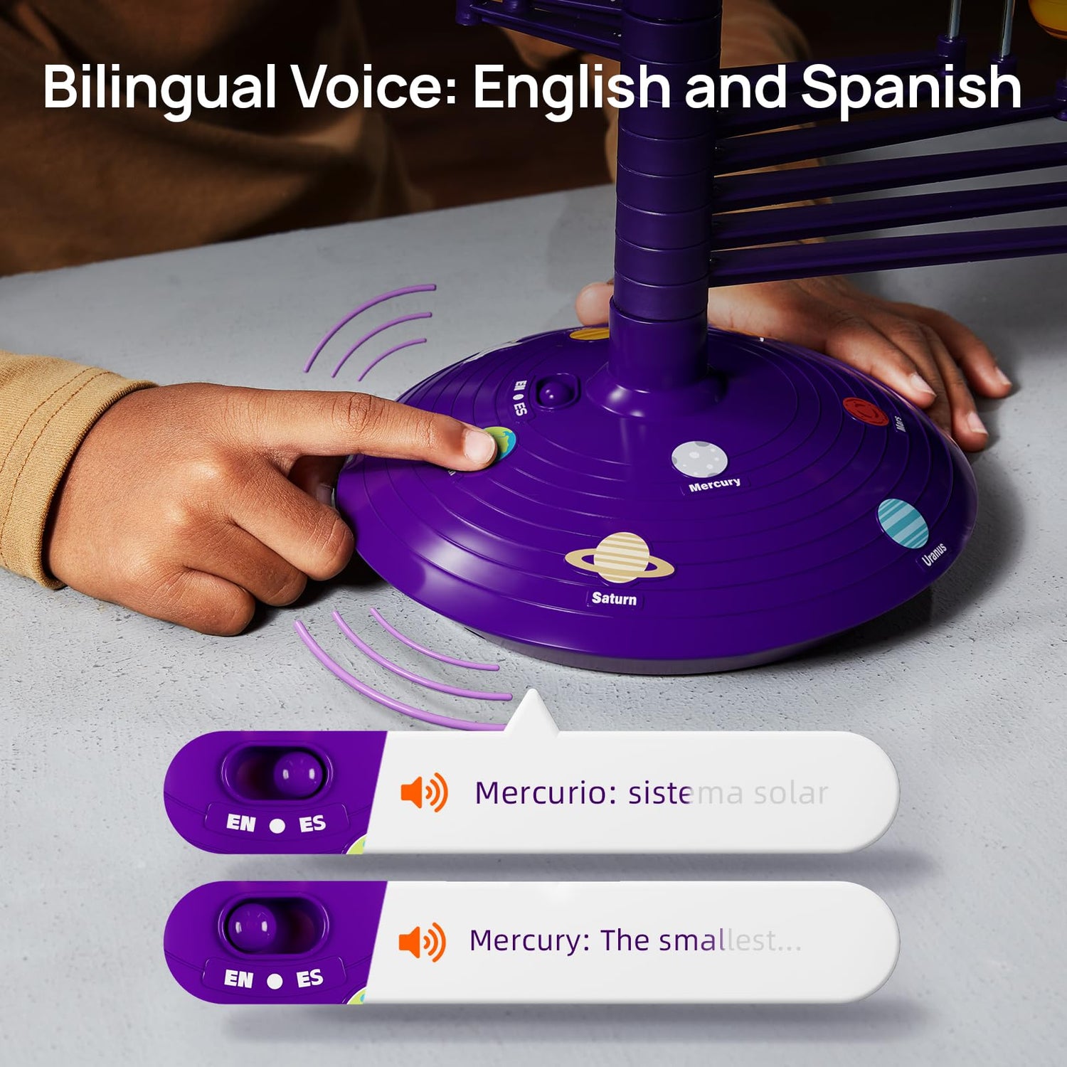 - TALKING SOLAR SYSTEM MODEL: Our educational toy includes both English and Spanish options. Children can press the planet pattern on the base to get interesting educational facts about astronomy and help them expand their knowledge of the solar system. It’s easy to use and fun to learn, making it a real educational toy for kids aged 5-7
