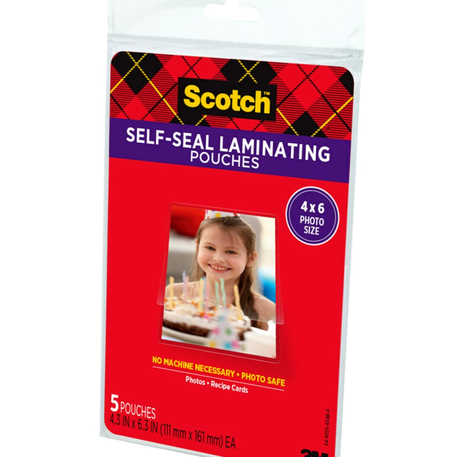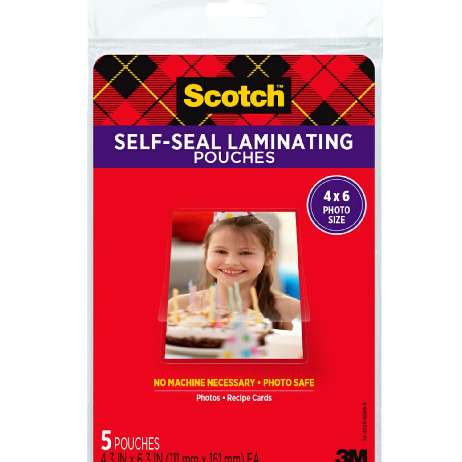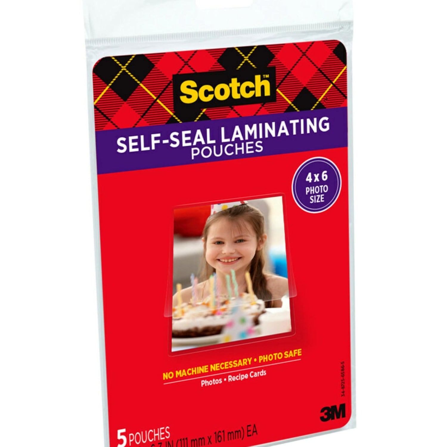 Details: Scotch Self Sealing Laminating Pouches provide instant, permanent document laminating without heat or hassle. Easy to use...no special tools or equipment needed. Protects and preserves photos without the use of a machine. Acid free and photo safe. Ultra clear to preserve important images, memories, cards and more. Ideal for marker-proof, tear-proof and spill-proof needs in the home, office or classroom. Includes 3 Packages of 5 pouches, 15 Total, 4 in. x 6 in.