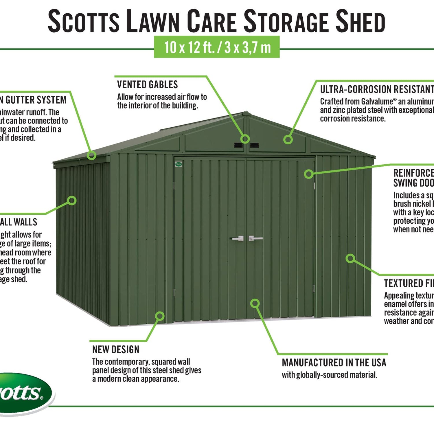 Details: The Scotts Steel Storage Shed will add an attractive and functional storage space. This 10’ x 12’ steel storage building is engineered with a premium steel material to provide superior protection for your stored gardening supplies and lawn equipment. Constructed from Galvalume, an aluminum and zinc plated steel, this shed is a long-lasting storage option for your property. This plated steel is highly anti-corrosive and is finished in a wrinkle paint textured finish. This helps provide additional safeguarding against harmful weather, rust, and corrosion. This reliable storage building is designed with a tall pent roof for added headroom and a squared wall design for a sleek look. The metal shed features tall 72" vertical wall panels to help store taller items and provide adequate walk around space. With the 63.44" wide x 69.77" high shed entrance, you can easily access the shed's interior and retrieve items effortlessly. The reinforced and sturdy wide door allows easy access to the interior of your storage shed, while also allowing storage against the front wall. Protect your items from theft with the lockable swing shed door, which features a brushed nickel key lock handle. Gable vents provide increased air flow to the shed's interior. The shed comes ready to assemble with pre-cut and pre-drilled parts. Proudly made in the USA with globally sourced material. The outside storage shed measures 144.7" D x 125.3" W x 91.4" H with 117 sq. feet of storage space.