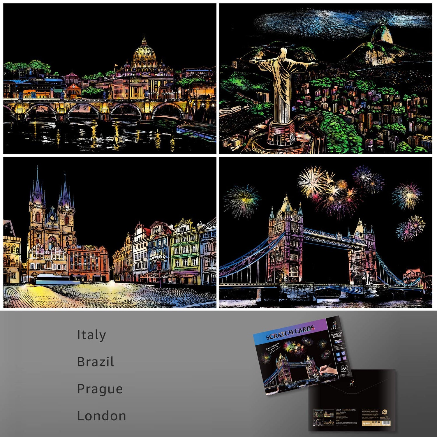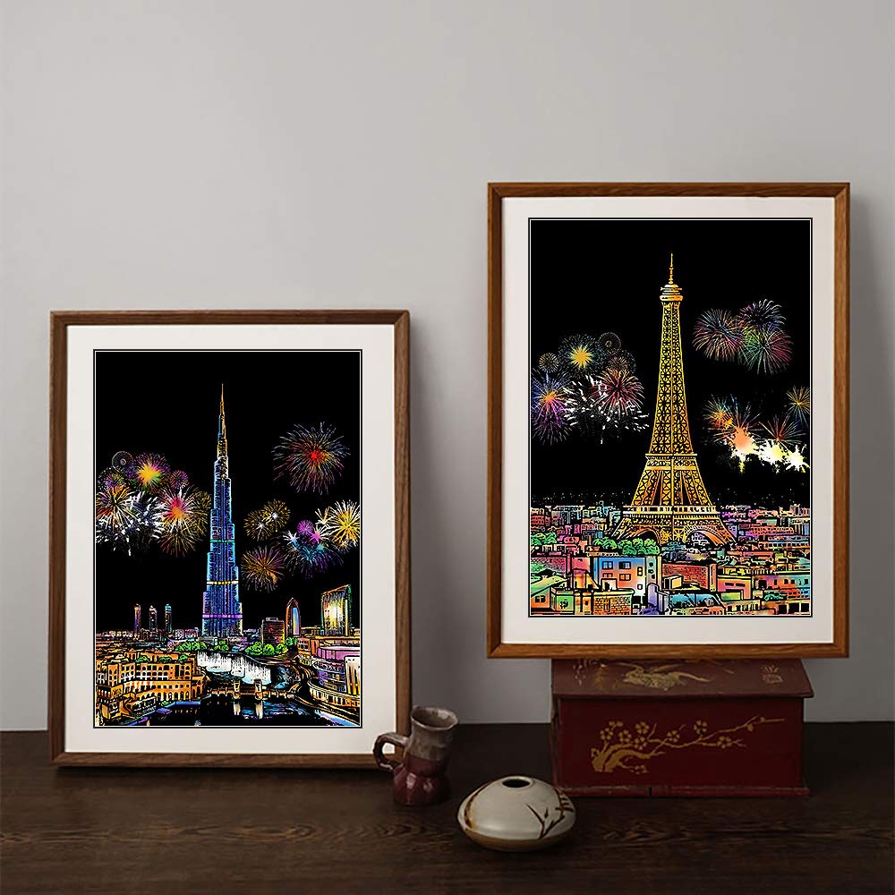 Scratch Art Painting Kits for Adults & Kids, Rainbow Painting Sketch Night View Scratchboard(A4), Crafts Set: 8 Sheets Scratch Cards with 6 tools in Bag - Creative Craft Art Set (Landmark Building)
