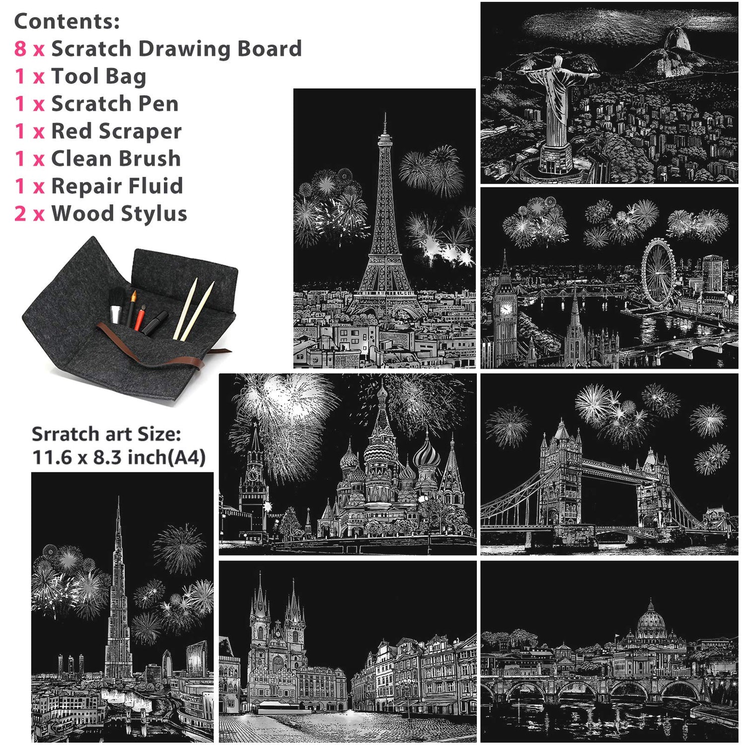 - 【PACKAGE INCLUDING】: 8 x Scratch Drawing Board, 1 x Scratch Pen, 1 x Red Scraper, 1 x Clean Brush, 1 x Repair Fluid, 2 x Wood Stylus Stick, 1 x Tool Bag. - 11.6 x 8.3 inch(A4)